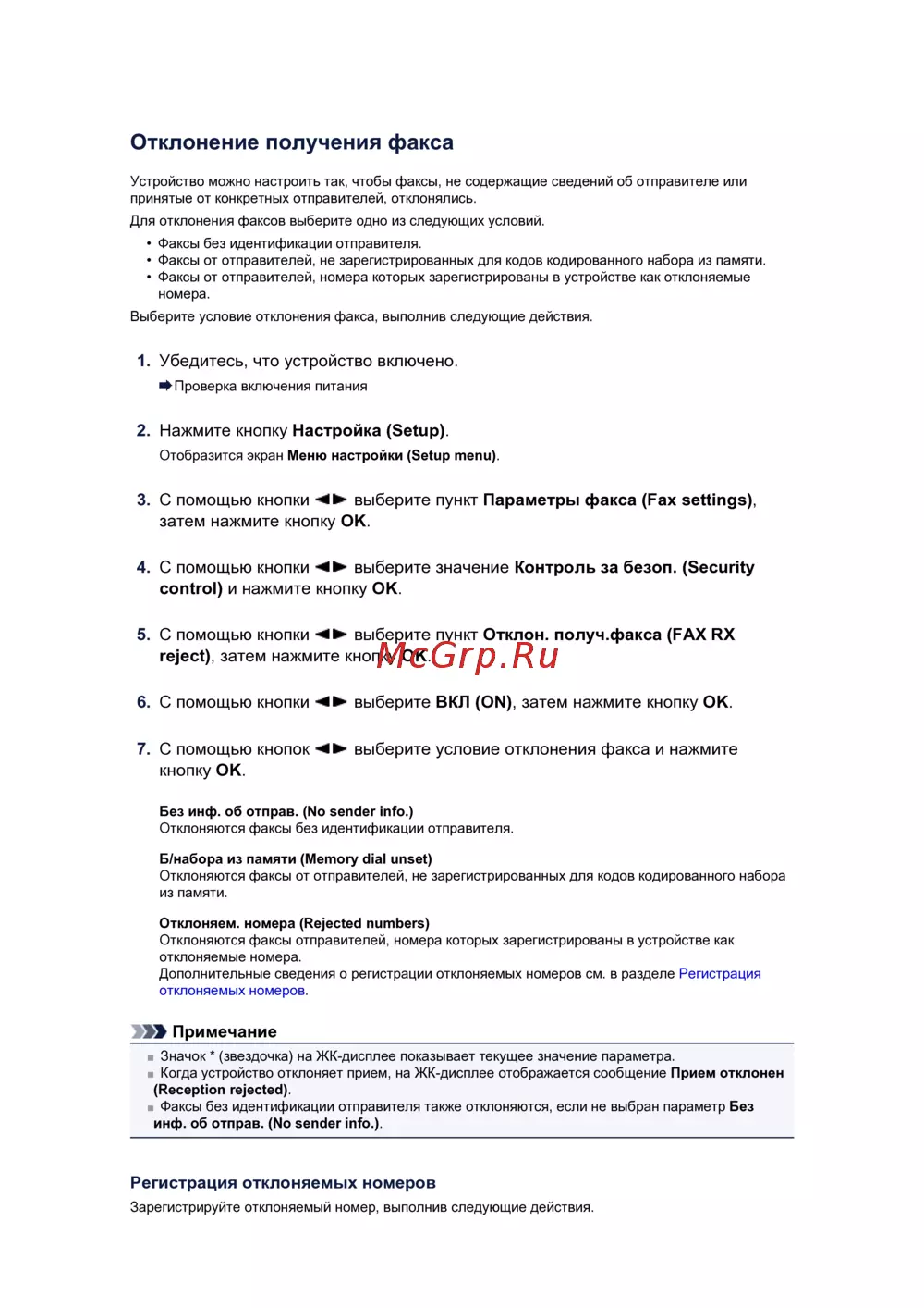 Отклоняются факсы отправителей, номера которых зарегистрированы в устройстве как