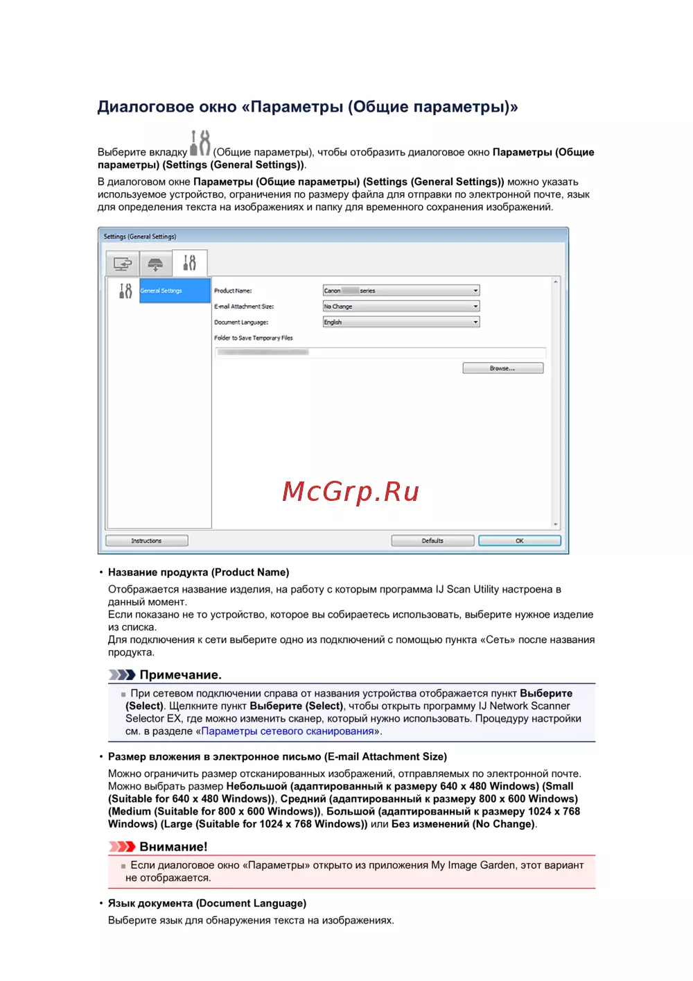 Если диалоговое окно «Параметры» открыто из приложения My Image Garden, этот вариант