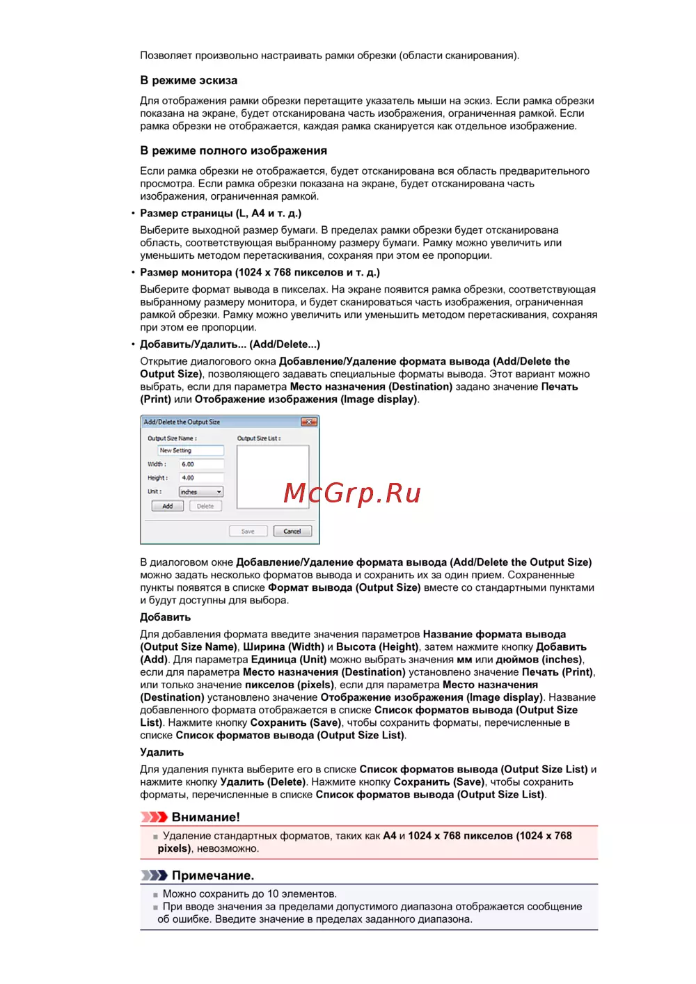 В диалоговом окне Добавление/Удаление формата вывода (Add/Delete the Output Size)