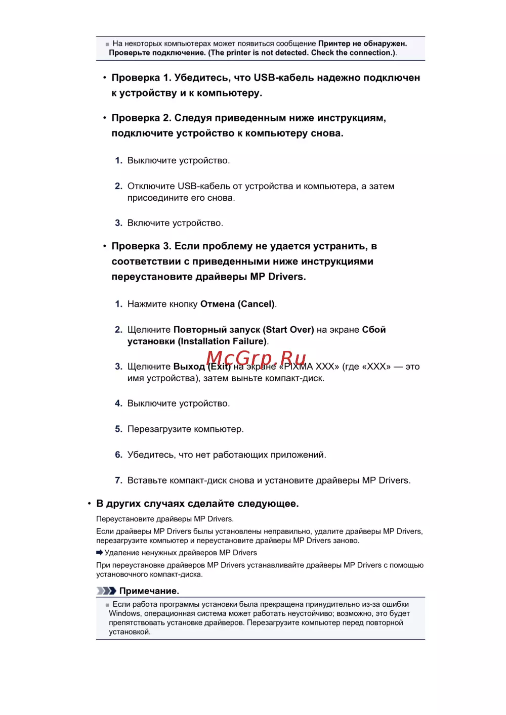 Canon PIXMA MX454 [800/897] Проверка 3 если проблему не удается устранить в соответствии с приведенными ниже инструкциями переустановите драйверы mp drivers