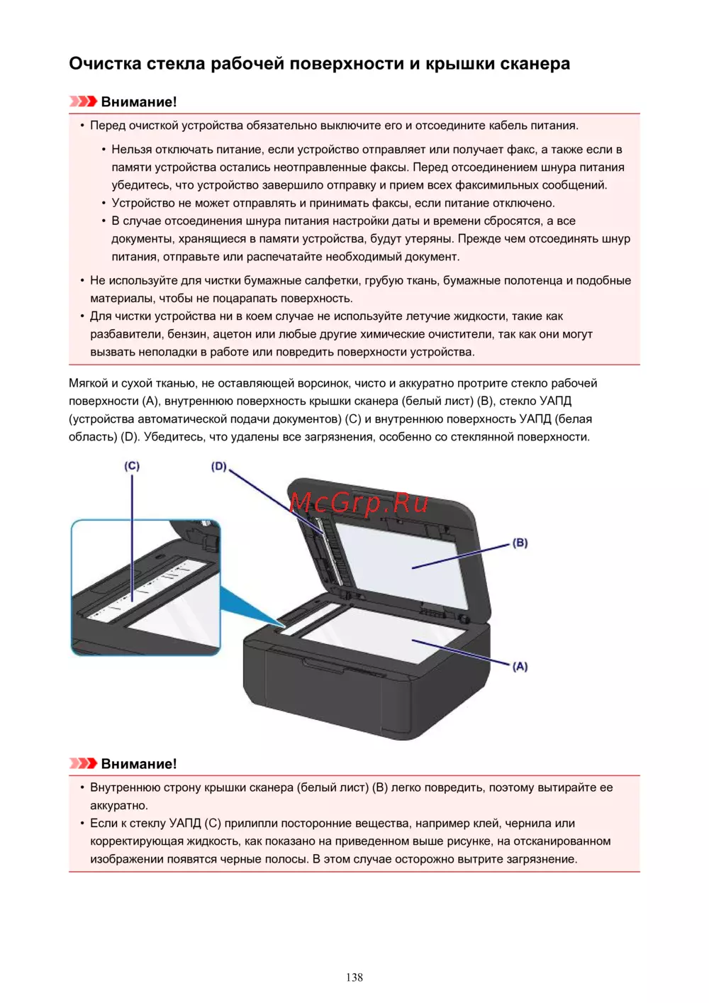 Canon PIXMA MX474 [138/980] Очистка стекла рабочей поверхности и крышки сканера