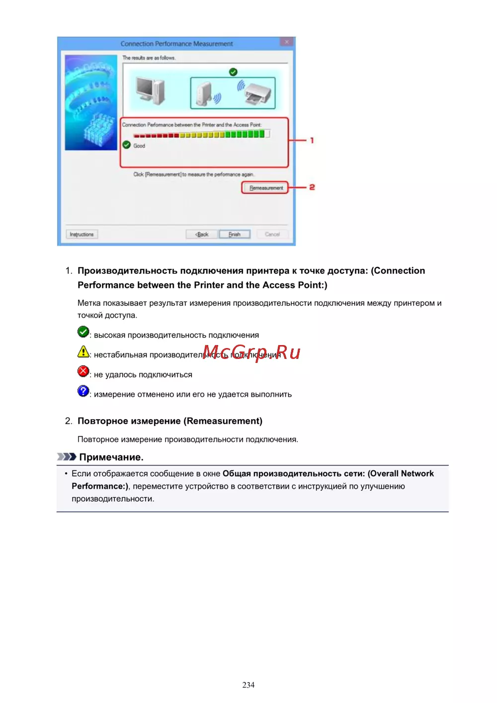 Производительность подключения принтера к точке доступа: (Connection