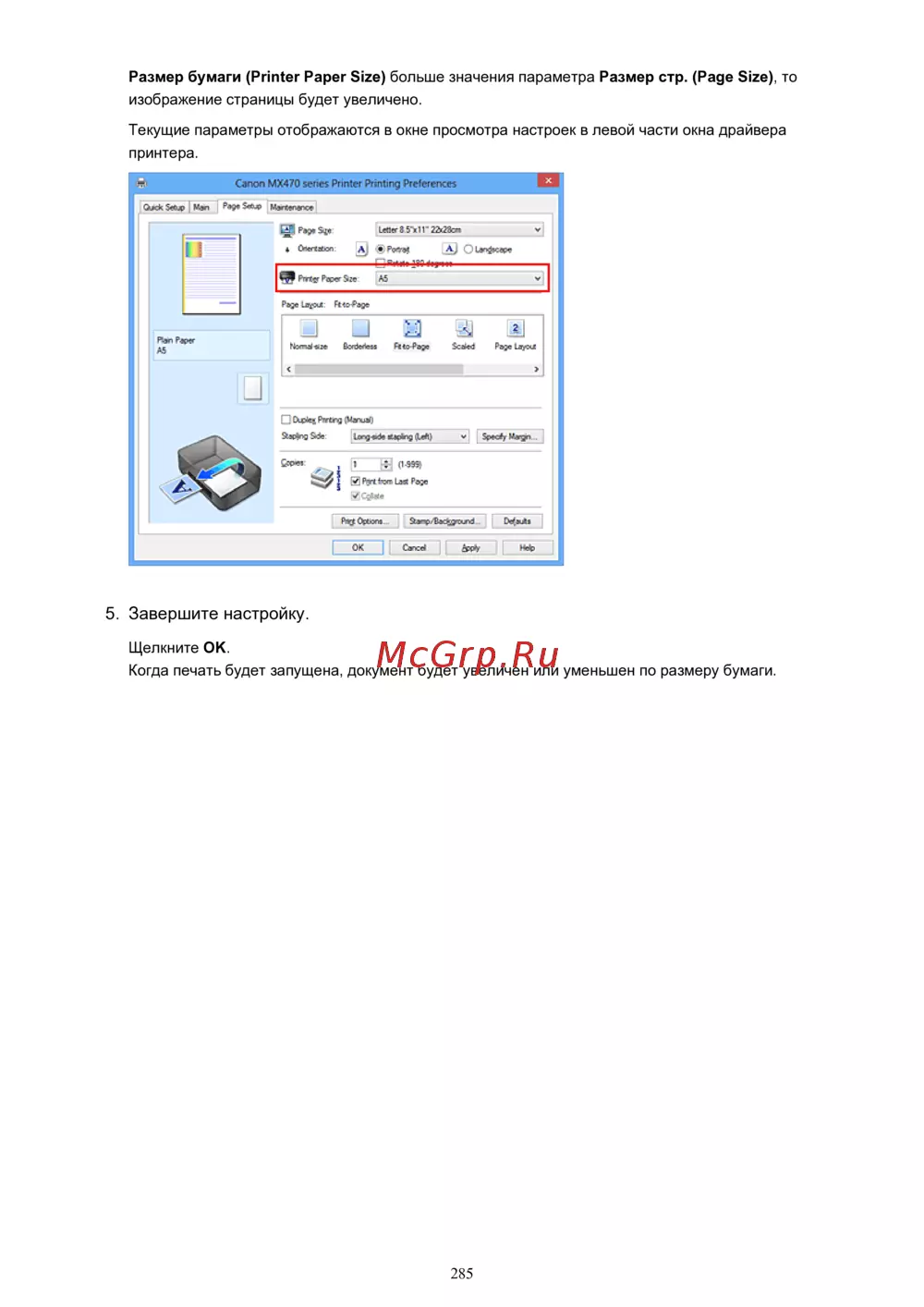 Когда печать будет запущена, документ будет увеличен или уменьшен по размеру бумаги.