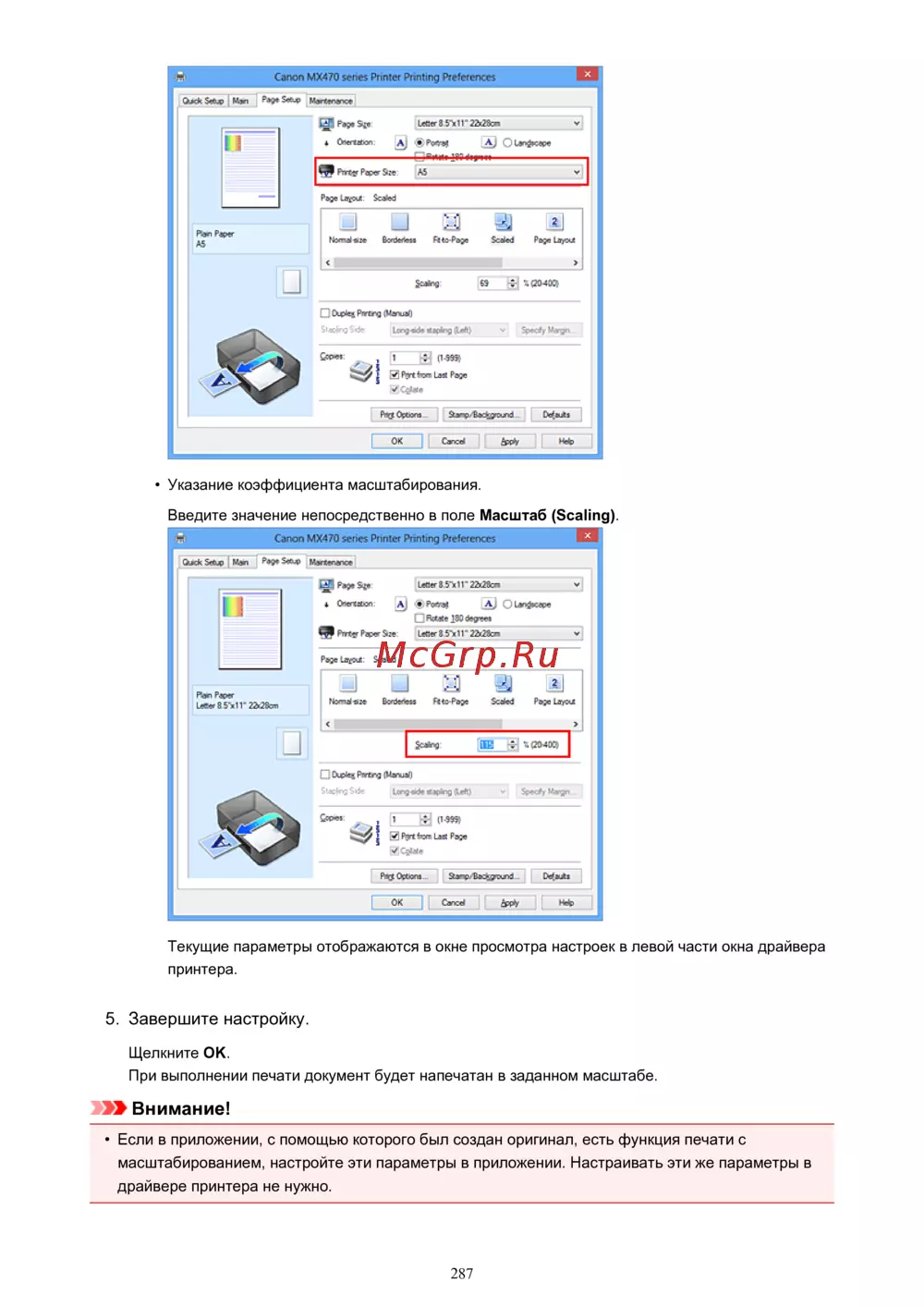 Canon PIXMA MX474 [287/980] Если в приложении с помощью которого был создан оригинал есть функция печати с масштабированием настройте эти параметры в приложении настраивать эти же параметры в драйвере принтера не нужно