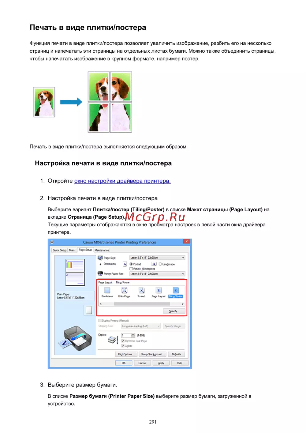 Canon PIXMA MX474 [291/980] Функция печати в виде плитки постера позволяет увеличить изображение разбить его на несколько страниц и напечатать эти страницы на отдельных листах бумаги можно также объединить страницы чтобы напечатать изображение в крупном формате например постер