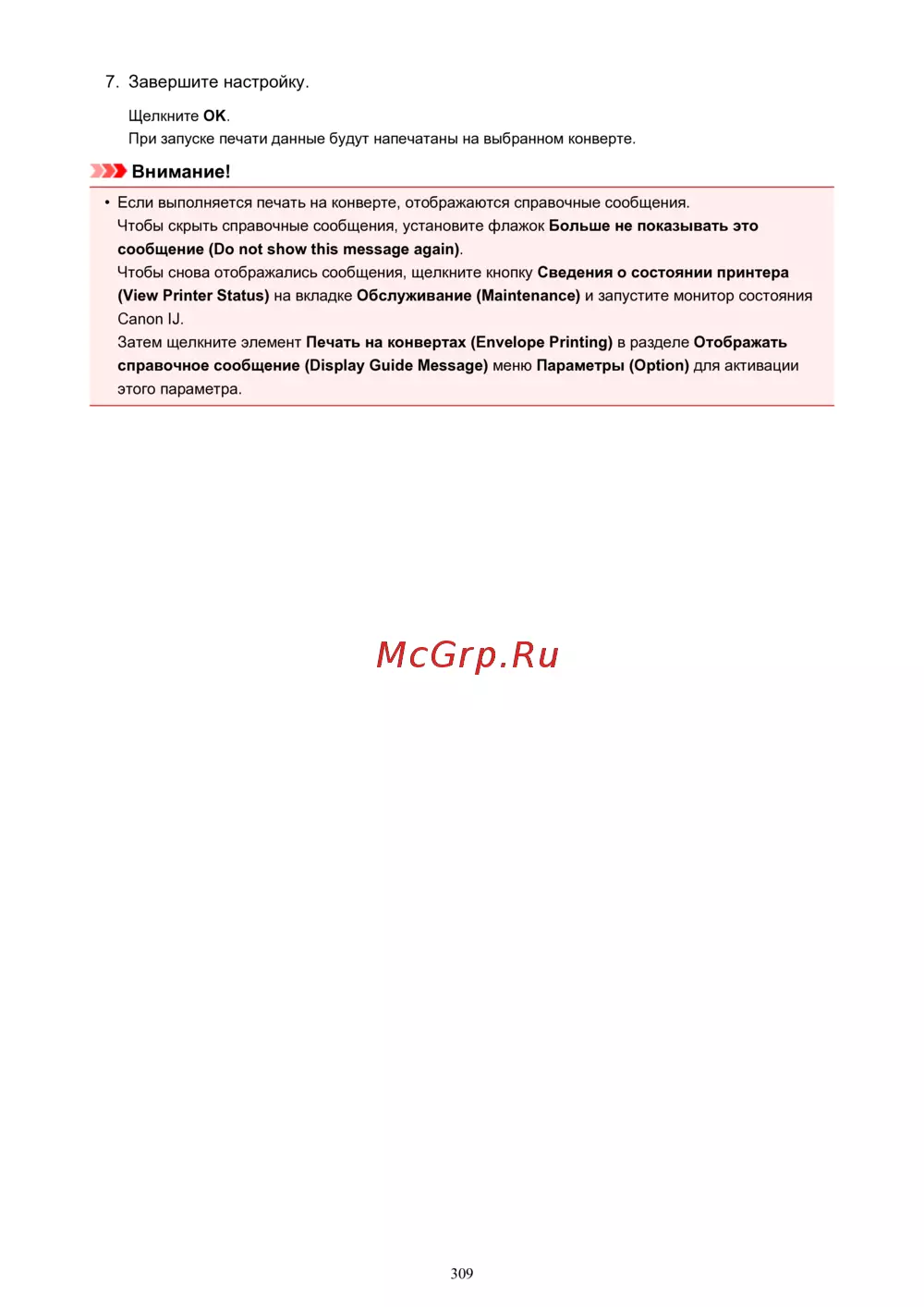 • Если выполняется печать на конверте, отображаются справочные сообщения.