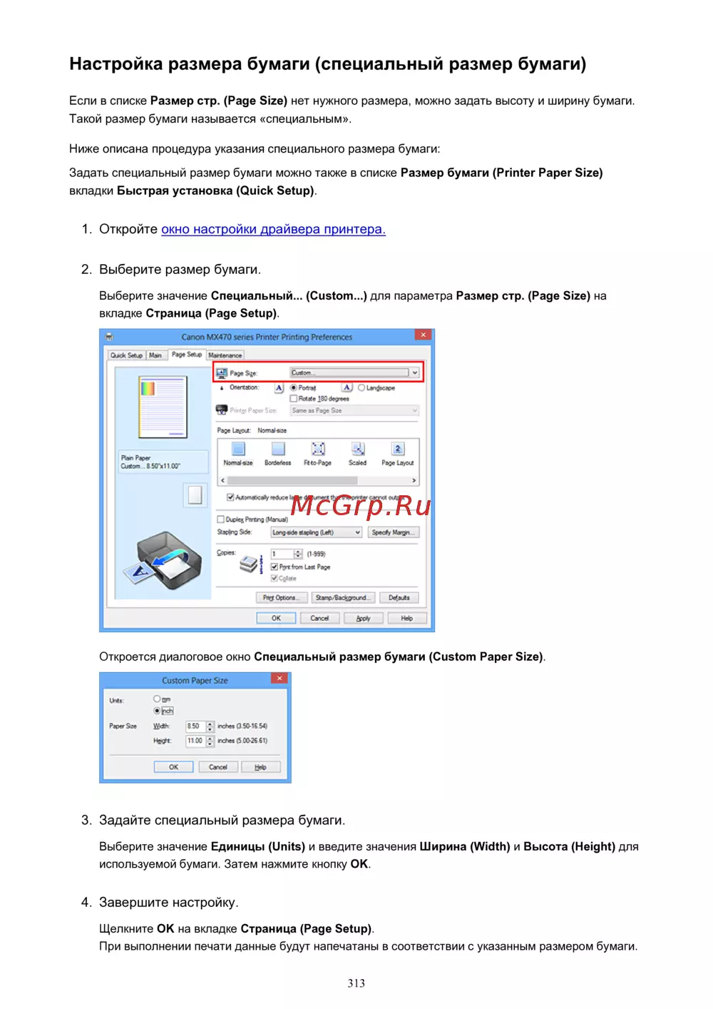 Если в списке Размер стр. (Page Size) нет нужного размера, можно задать высоту и ширину бумаги.