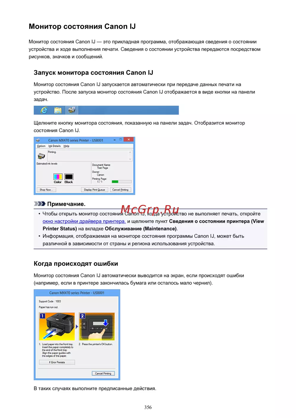 Монитор состояния Canon IJ автоматически выводится на экран, если происходят ошибки