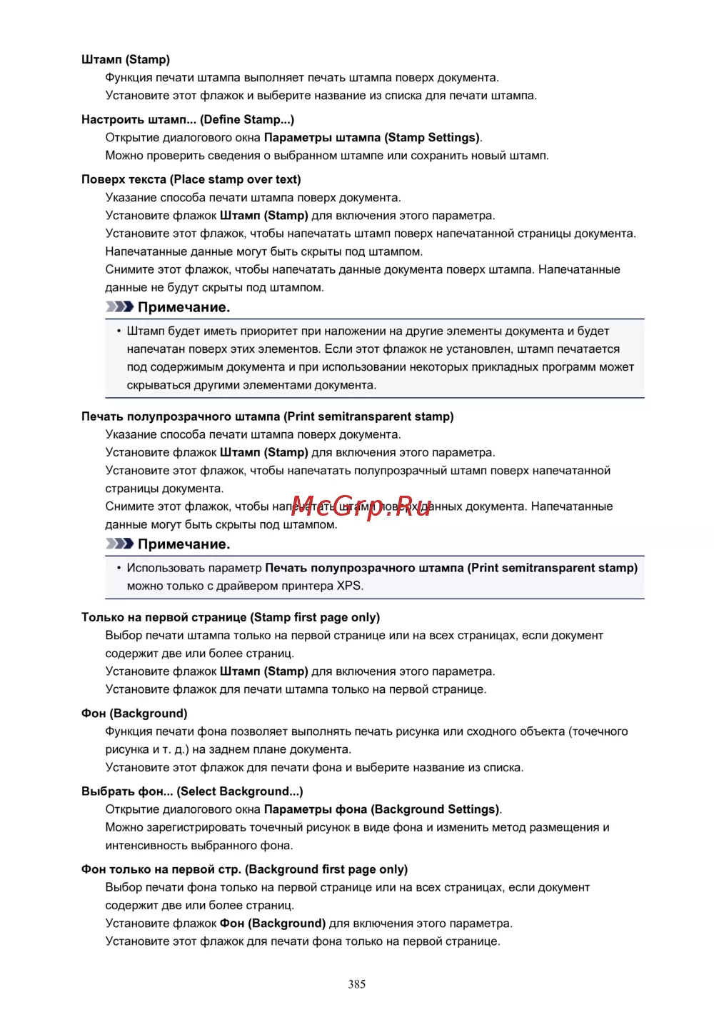 Установите этот флажок, чтобы напечатать полупрозрачный штамп поверх напечатанной