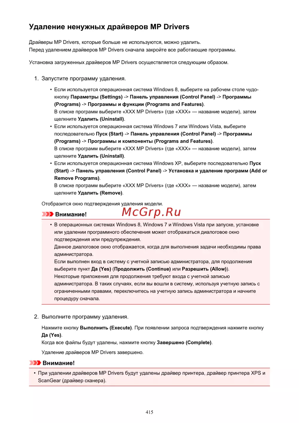 При удалении драйверов MP Drivers будут удалены драйвер принтера, драйвер принтера XPS и