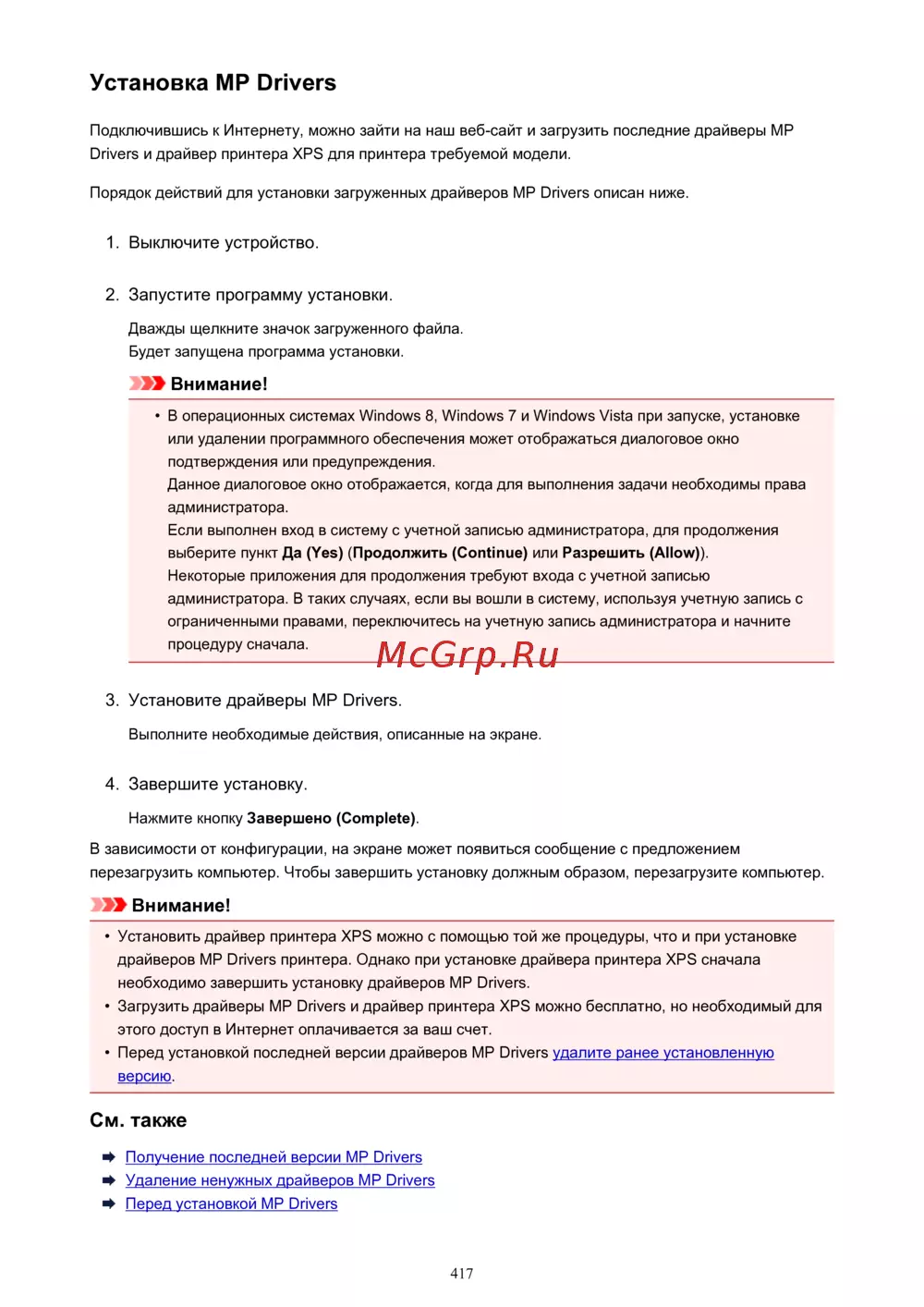 Перед установкой последней версии драйверов MP Drivers удалите ранее установленную