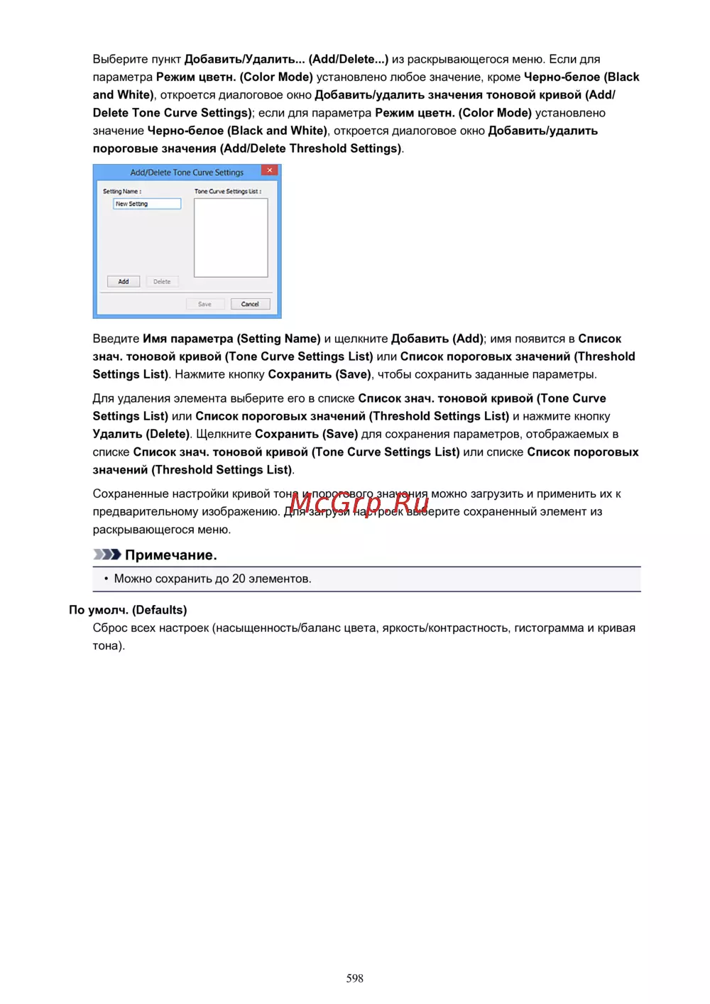 Delete Tone Curve Settings); если для параметра Режим цветн. (Color Mode) установлено