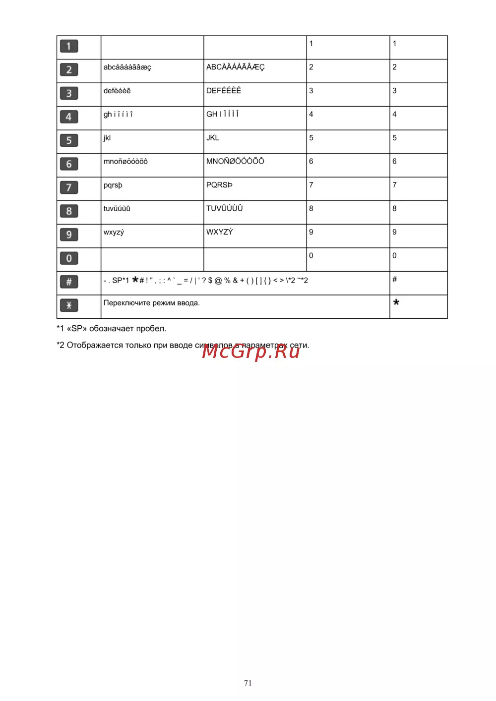 *2 Отображается только при вводе символов в параметрах сети.