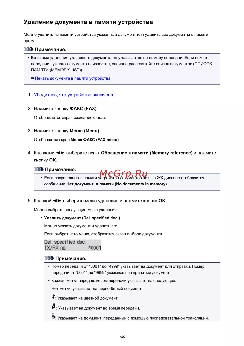 Можно удалить из памяти устройства указанный документ или удалить все документы в памяти