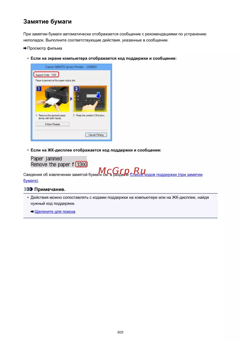 Сведения об извлечении замятой бумаги см. в разделе Список кодов поддержки (при замятии