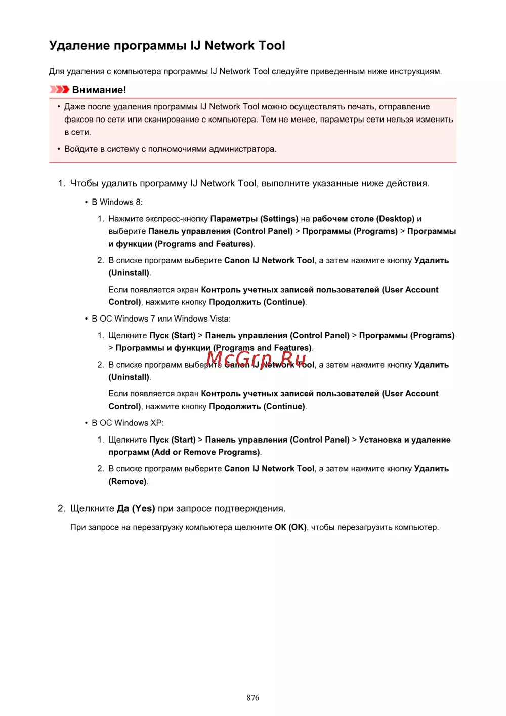 Canon PIXMA MX474 [876/980] Для удаления с компьютера программы ij network tool следуйте приведенным ниже инструкциям