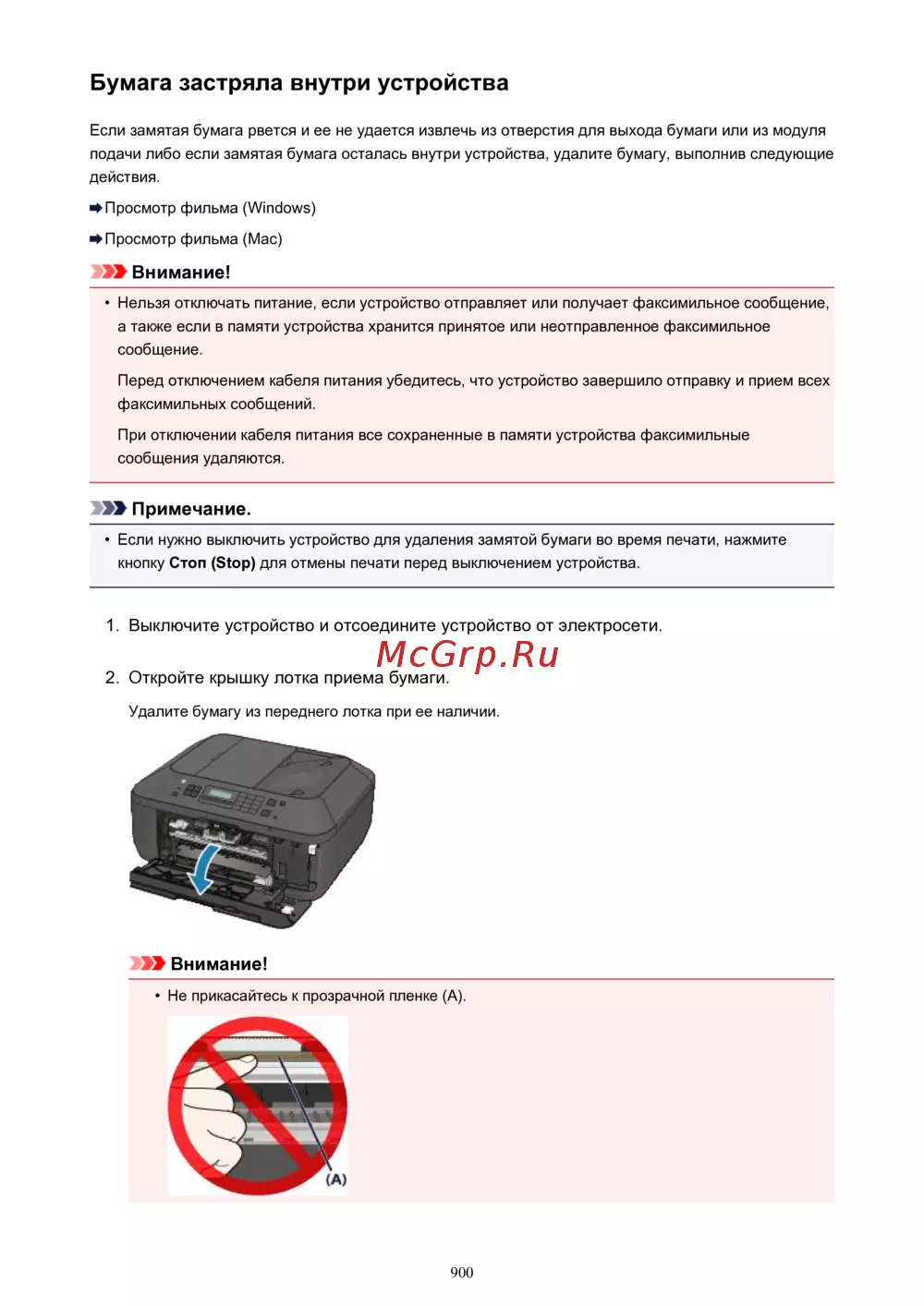 подачи либо если замятая бумага осталась внутри устройства, удалите бумагу, выполнив следующие