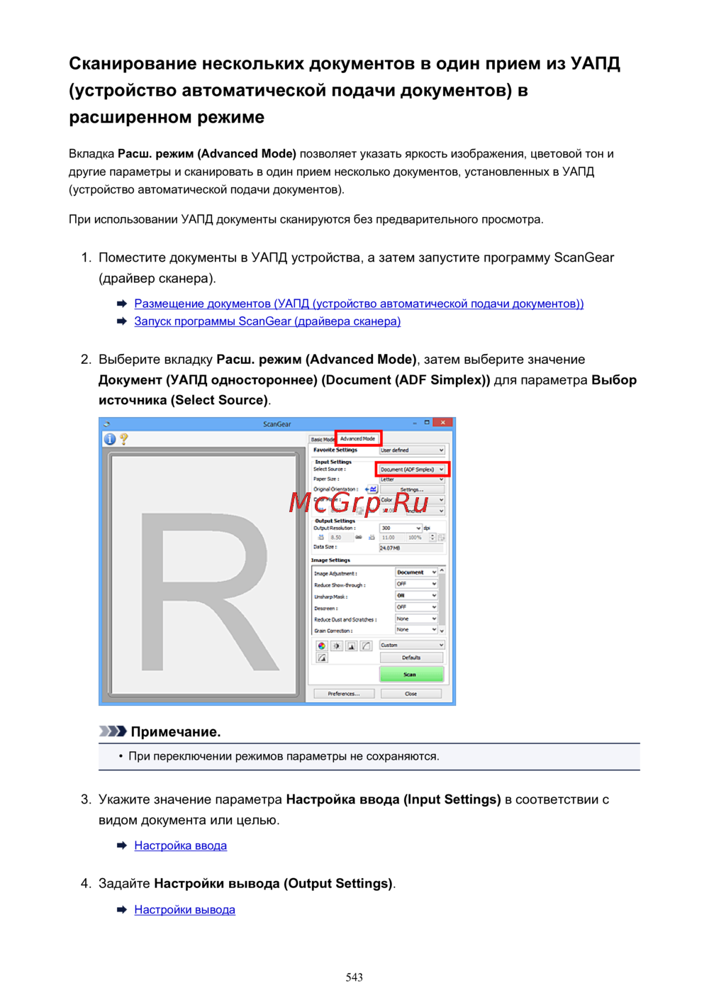 Поместите документы в УАПД устройства, а затем запустите программу ScanGear