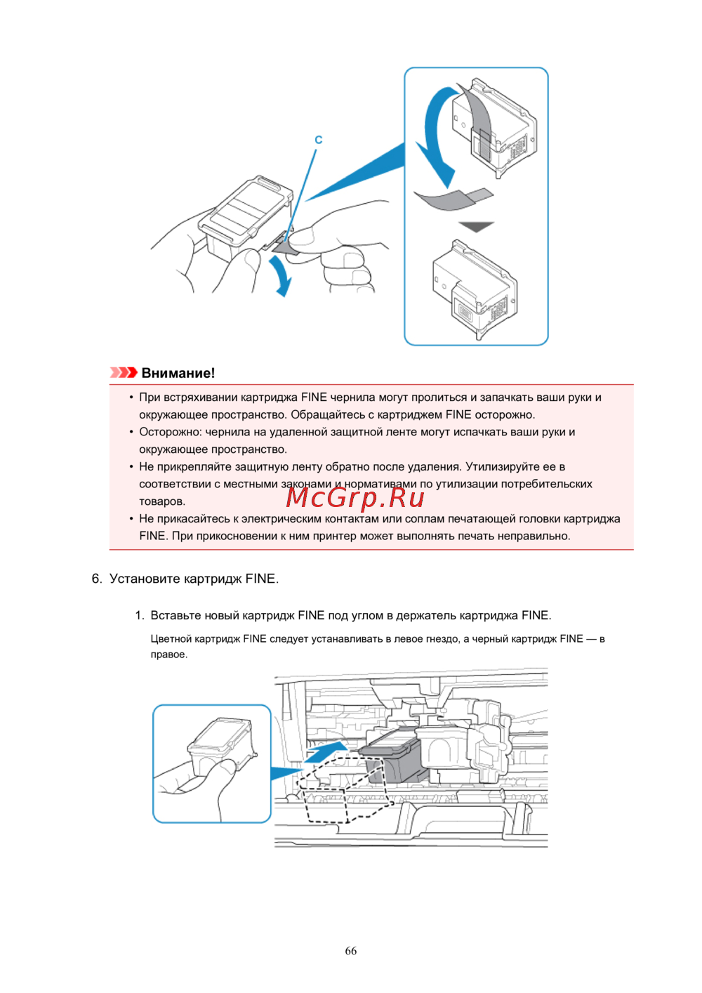 • При встряхивании картриджа FINE чернила могут пролиться и запачкать ваши руки и