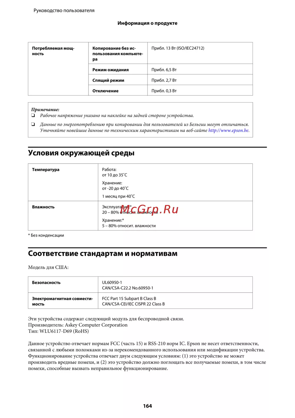 - Данное устройство отвечает нормам fcc часть 15 и rss 210 норм ic epson не несет ответственности связанной с любыми поломками из за нерекомендованного использования или модификации устройства функционирование устройства отвечает двум следующим условиям 1 это устройство не может производить вредные помехи и 2 это устройство должно поглощать все получаемые помехи в том числе помехи способные вызвать неправильное функционирование p.164