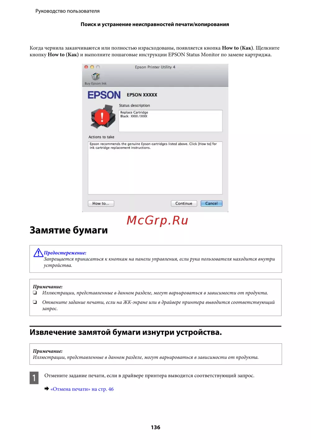кнопку How to (Как) и выполните пошаговые инструкции EPSON Status Monitor по замене картриджа.
