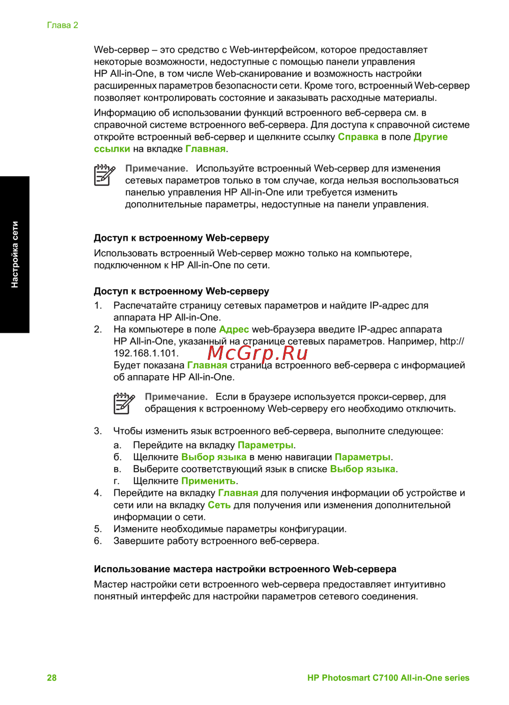 - Если компьютер подключен к hp all in one с помощью проводной сети можно воспользоваться встроенным web сервером аппарата hp all in one встроенный p.30