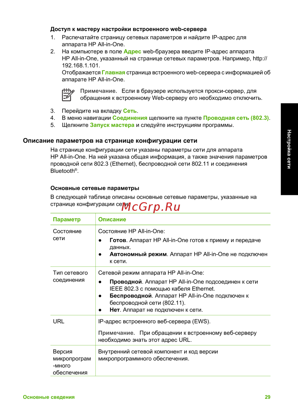 HP Photosmart C7183 [32/133] Основные сетевые параметры