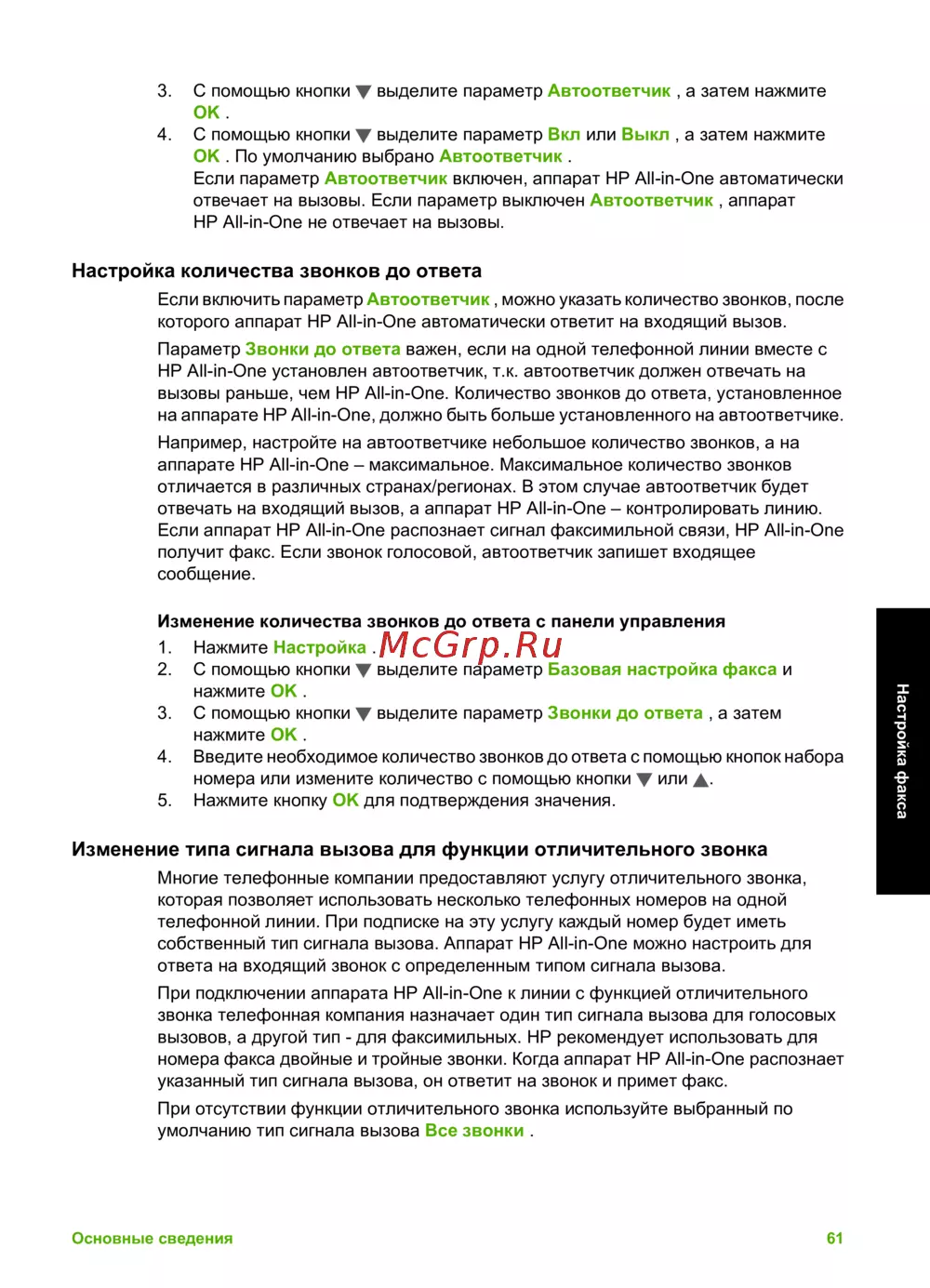 - Выделите параметр базовая настройка факса и нажмите ok 3 с помощью кнопки выделите параметр звонки до ответа а затем нажмите ok 4 введите необходимое количество звонков до ответа с помощью кнопок набора номера или измените количество с помощью кнопки или 5 нажмите кнопку ok для подтверждения значения p.64