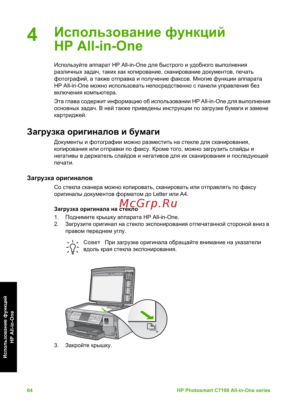 основных задач. В ней также приведены инструкции по загрузке бумаги и замене