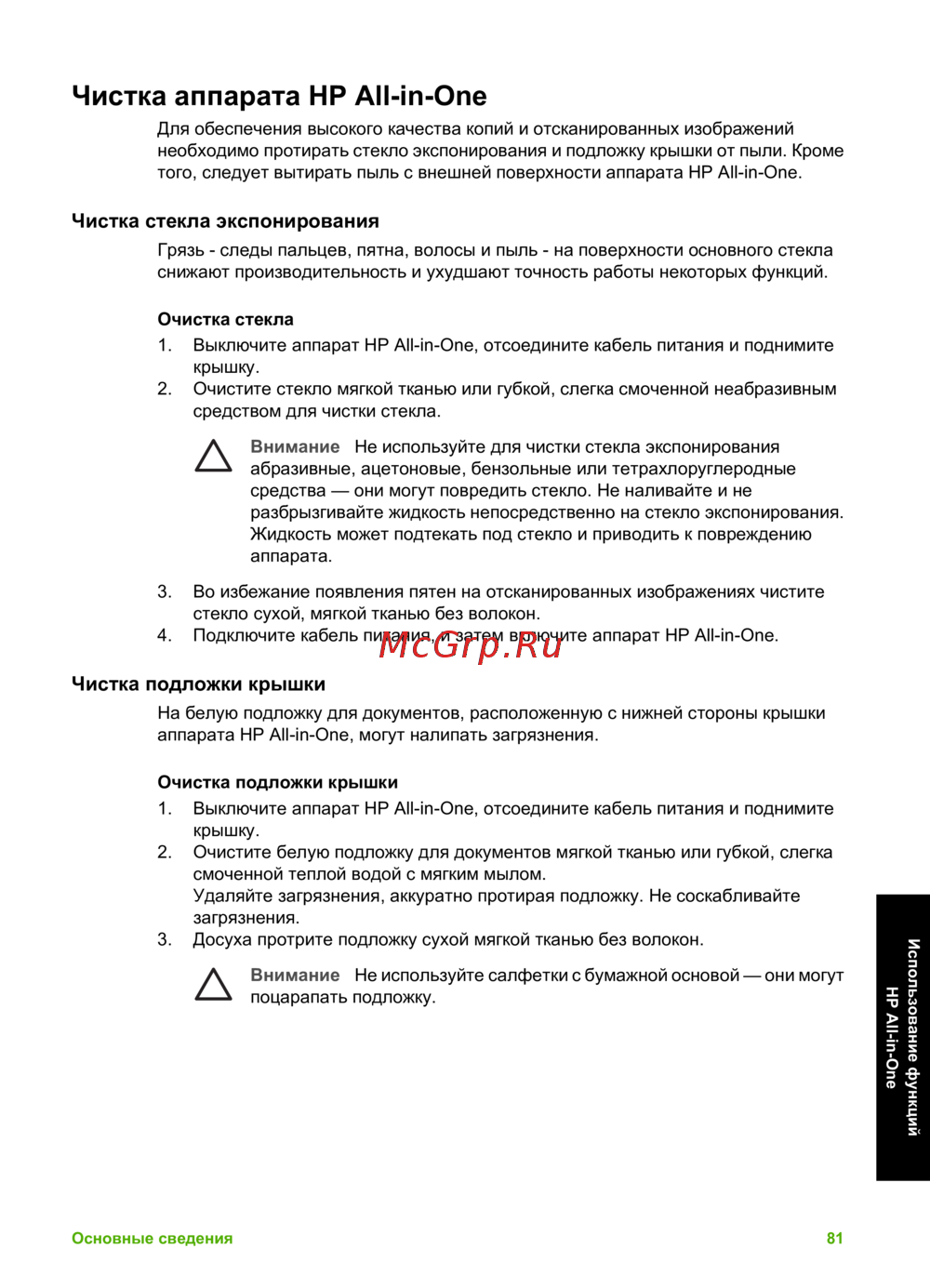 того, следует вытирать пыль с внешней поверхности аппарата HP All-in-One.
