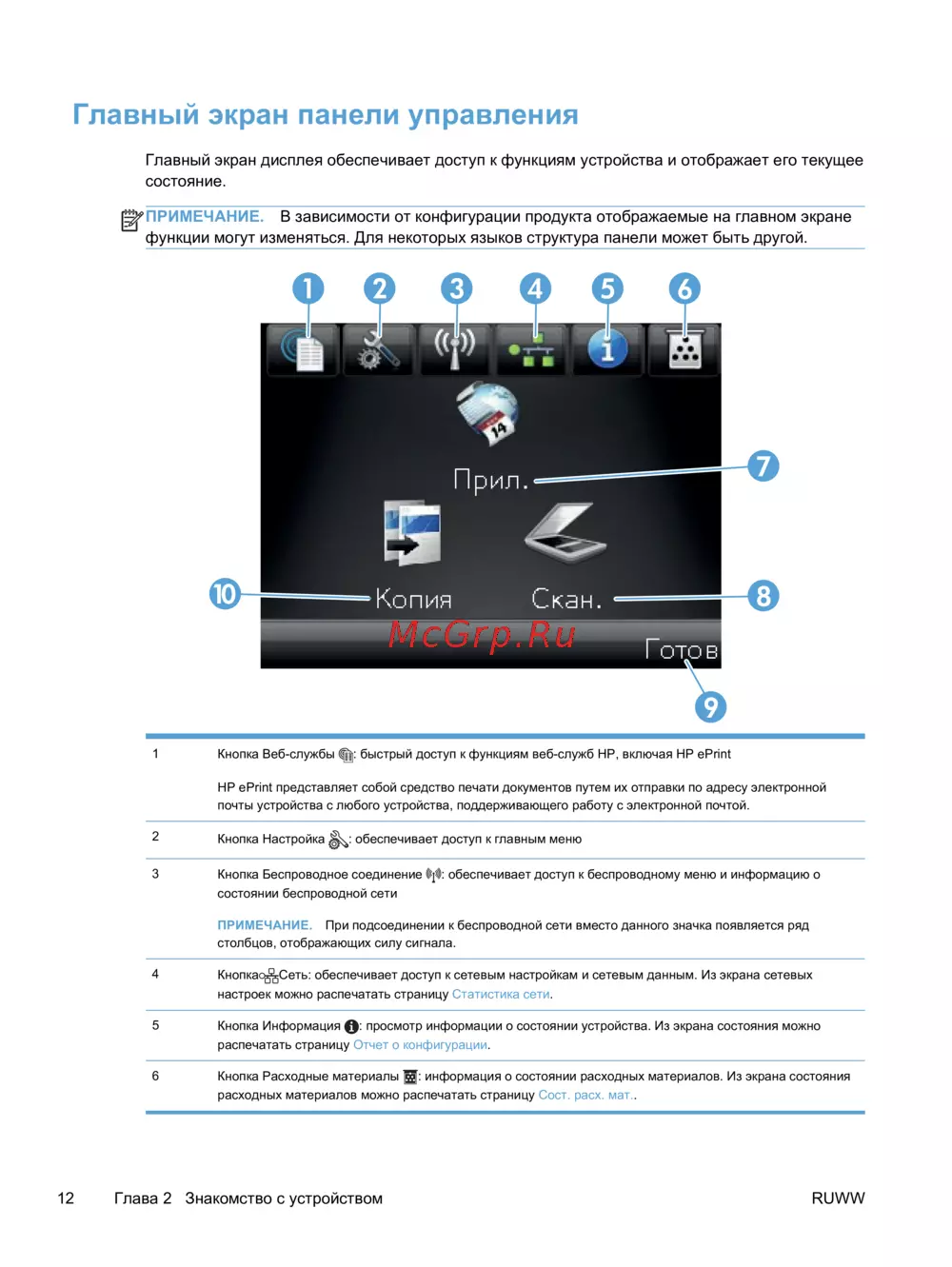 ![HP TopShot LaserJet Pro M275 [22/216] Примечание в зависимости от конфигурации продукта отображаемые на главном экране функции могут изменяться для некоторых языков структура панели может быть другой](/views2/1081452/page22/bg16.png)
