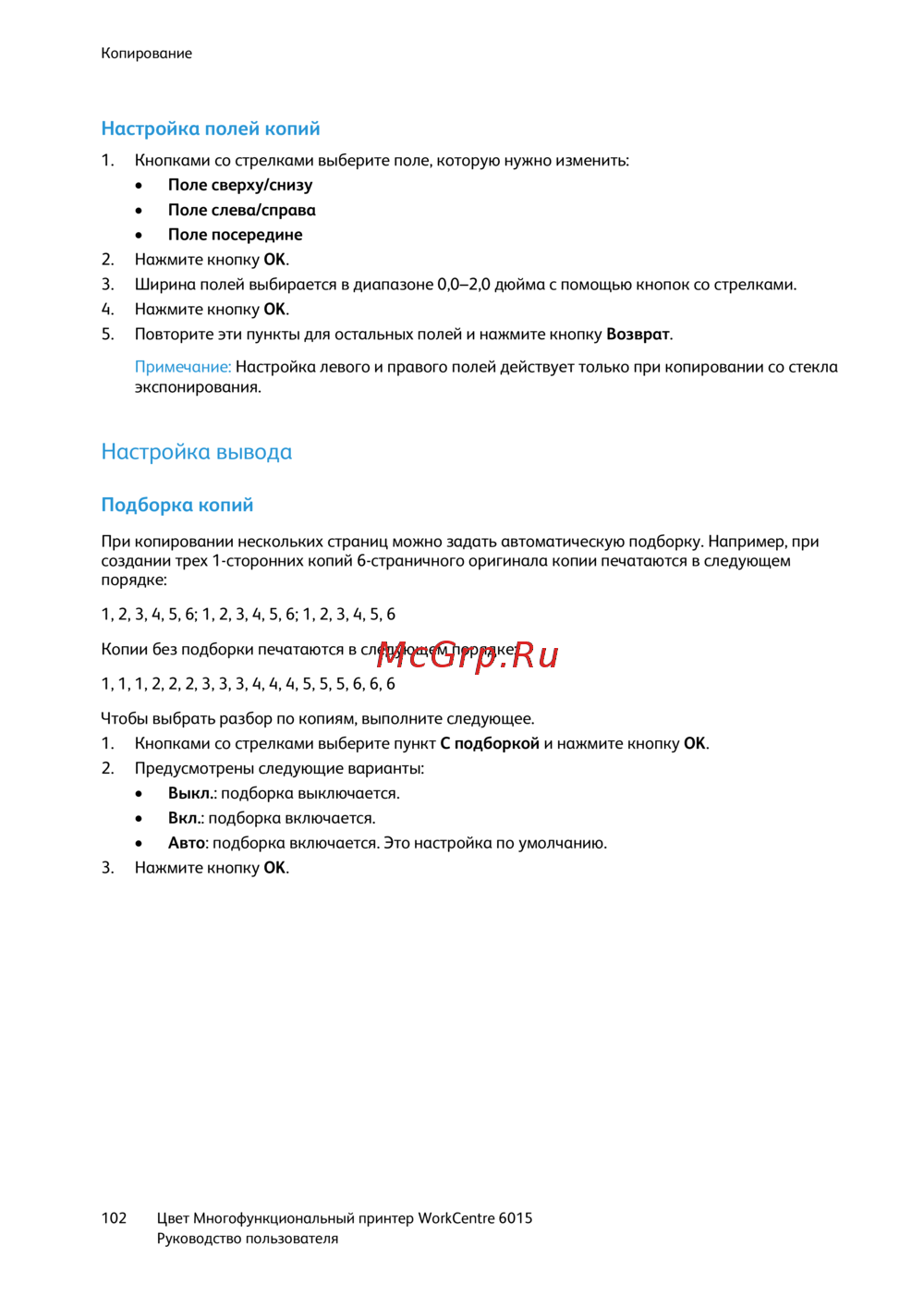 Xerox WorkCentre 6015 — настройка полей копий и подборки на многофункциональном принтере [102/218]