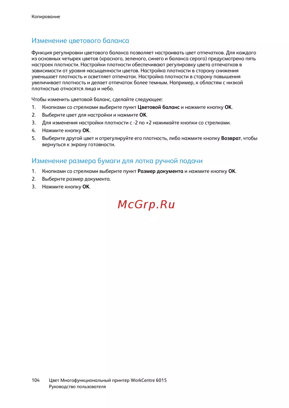 Xerox WorkCentre 6015 — настройка цветового баланса и размера бумаги в принтере [104/218]