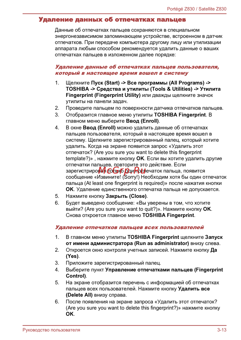 Toshiba Portege Z830 [58/168] Удаление данных об отпечатках пальцев