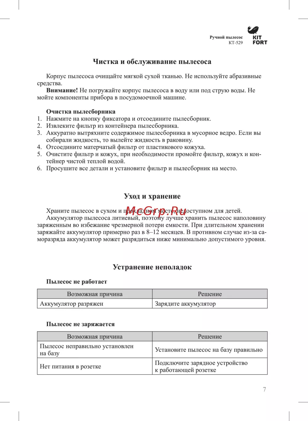 й Ручной пылесос KIT КТ 529 FORT Чистка и обслуживание пылесоса Корпус пылесоса очищайте мягкой сухой тканью Не используйте абразивные средства Внимание Не погружайте корпус пылесоса в воду или под струю воды Не мойте компоненты прибора в посудомоечной машине Очистка пылесборника 1 Нажмите на кнопку фиксатора и отсоедините пылесборник 2 Извлеките фильтр из контейнера пылесборника 3 Аккуратно вытряхните содержимое пылесборника в мусорное ведро Если вы собирали жидкость то вылейте жидкость в раковину 4 Отсоедините матерчатый фильтр от пластикового кожуха 5 Очистите фильтр и кожух при необходимости промойте фильтр кожух и кон тейнер чистой теплой водой 6 Просушите все детали и установите фильтр и пылесборник на место Уход и хранение Храните пылесос в сухом и прохладном месте недоступном для детей Аккумулятор пылесоса литиевый поэтому лучше хранить пылесос наполовину заряженным во избежание чрезмерной потери емкости При длительном хранении заряжайте аккумулятор примерно раз в 8 12 месяцев В противном случае из за са моразряда аккумулятор может разрядиться ниже минимально допустимого уровня Устранение неполадок Пылесос не работает Возможная причина Аккумулятор разряжен Решение Зарядите аккумулятор Пылесос не заряжается Возможная причина Решение Пылесос неправильно установлен на базу Установите пылесос на базу правильно Нет питания в розетке Подключите зарядное устройство к работающей розетке 7