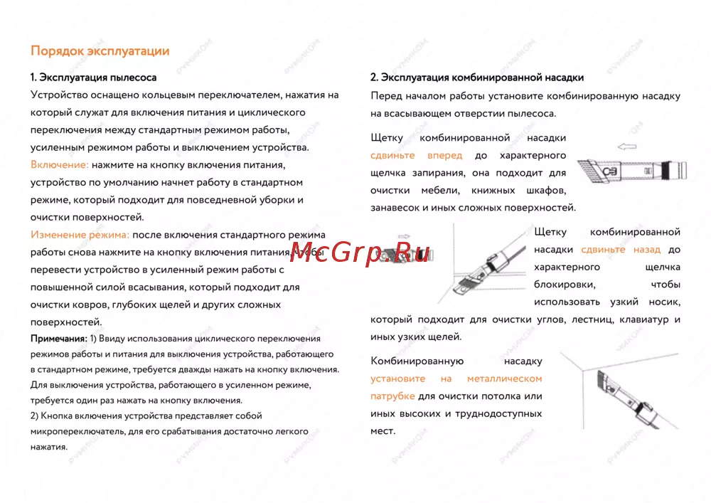 Узнайте, как правильно использовать пылесос и комбинированную насадку для эффективной уборки. Подробные инструкции по режимам работы и установке насадок.