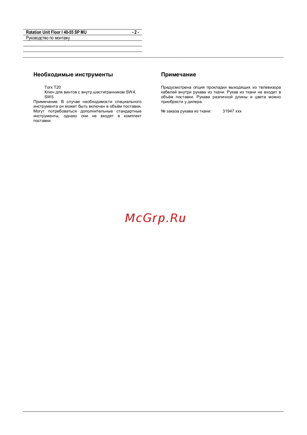 Loewe Rotation Unit Floor I 40-55 MU SP 71782B00 — руководство по монтажу и необходимым инструментам для установки [2/8]