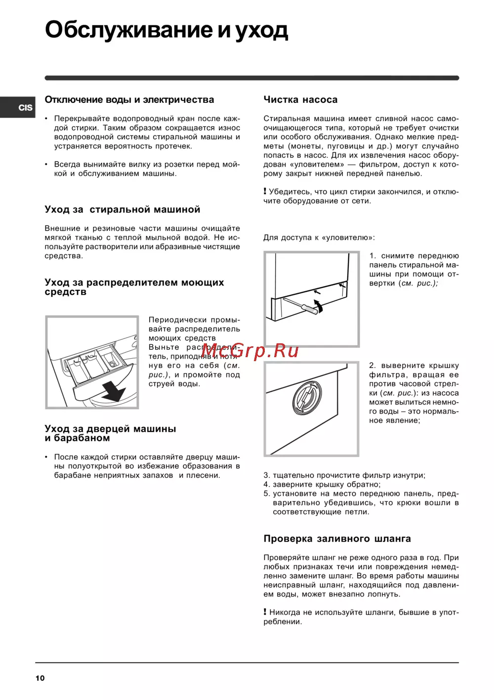 Обслуживание и уход СБ Отключение воды и электричества Чистка насоса Стиральная машина имеет сливной насос само очищающегося типа который не требует очистки или особого обслуживания Однако мелкие пред меты монеты пуговицы и др могут случайно попасть в насос Для их извлечения насос обору дован уловителем фильтром доступ к кото рому закрыт нижней передней панелью Перекрывайте водопроводный кран после каж дой стирки Таким образом сокращается износ водопроводной системы стиральной машины и устраняется вероятность протечек Всегда вынимайте вилку из розетки перед мой кой и обслуживанием машины Убедитесь что цикл стирки закончился и отклю чите оборудование от сети Уход за стиральной машиной Внешние и резиновые части машины очищайте мягкой тканью с теплой мыльной водой Не ис пользуйте растворители или абразивные чистящие средства Уход за распределителем средств моющих Периодически промы вайте распределитель моющих средств Выньте распредели тель приподняв и потя нув его на себя см рис и промойте под струей воды Для доступа к уловителю 1 снимите переднюю панель стиральной ма шины при помощи от вертки см рис 2 выверните крышку фильтра вращая ее против часовой стрел ки см рис из насоса может вылиться немно го воды это нормаль ное явление Уход за дверцей машины и барабаном После каждой стирки оставляйте дверцу маши ны полуоткрытой во избежание образования в барабане неприятных запахов и плесени 3 тщательно прочистите фильтр изнутри 4 заверните крышку обратно 5 установите на место переднюю панель пред варительно убедившись что крюки вошли в соответствующие петли Проверка заливного шланга Проверяйте шланг не реже одного раза в год При любых признаках течи или повреждения немед ленно замените шланг Во время работы машины неисправный шланг находящийся под давлени ем воды может внезапно лопнуть Никогда не используйте шланги бывшие в упот реблении 10