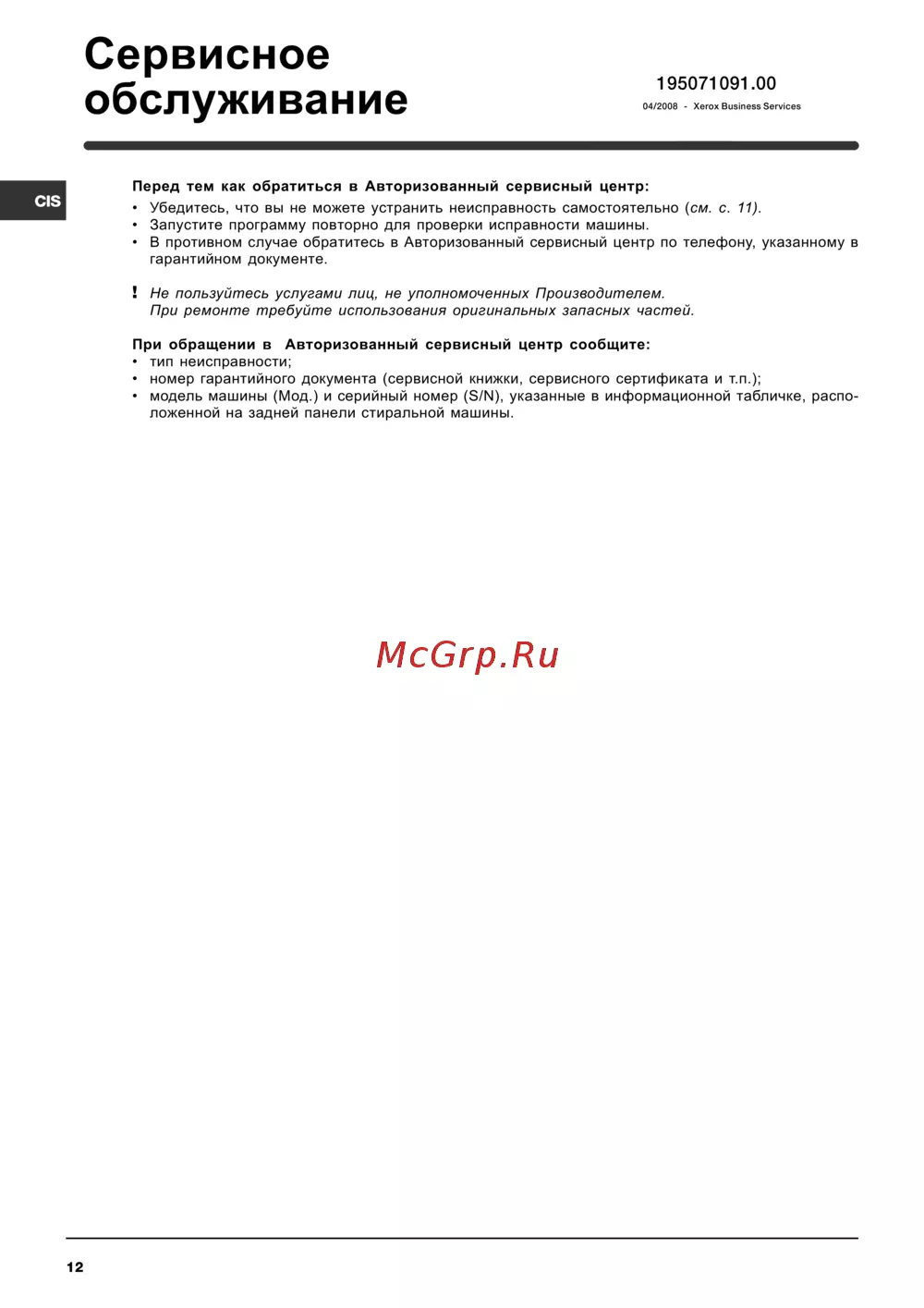 Сервисное обслуживание 195071091 00 04 2008 Xerox Business Services Перед тем как обратиться в Авторизованный сервисный центр С13 Убедитесь что вы не можете устранить неисправность самостоятельно см с 11 Запустите программу повторно для проверки исправности машины В противном случае обратитесь в Авторизованный сервисный центр по телефону указанному в гарантийном документе Не пользуйтесь услугами лиц не уполномоченных Производителем При ремонте требуйте использования оригинальных запасных частей При обращении в Авторизованный сервисный центр сообщите тип неисправности номер гарантийного документа сервисной книжки сервисного сертификата и т п модель машины Мод и серийный номер З Ы указанные в информационной табличке распо ложенной на задней панели стиральной машины 12