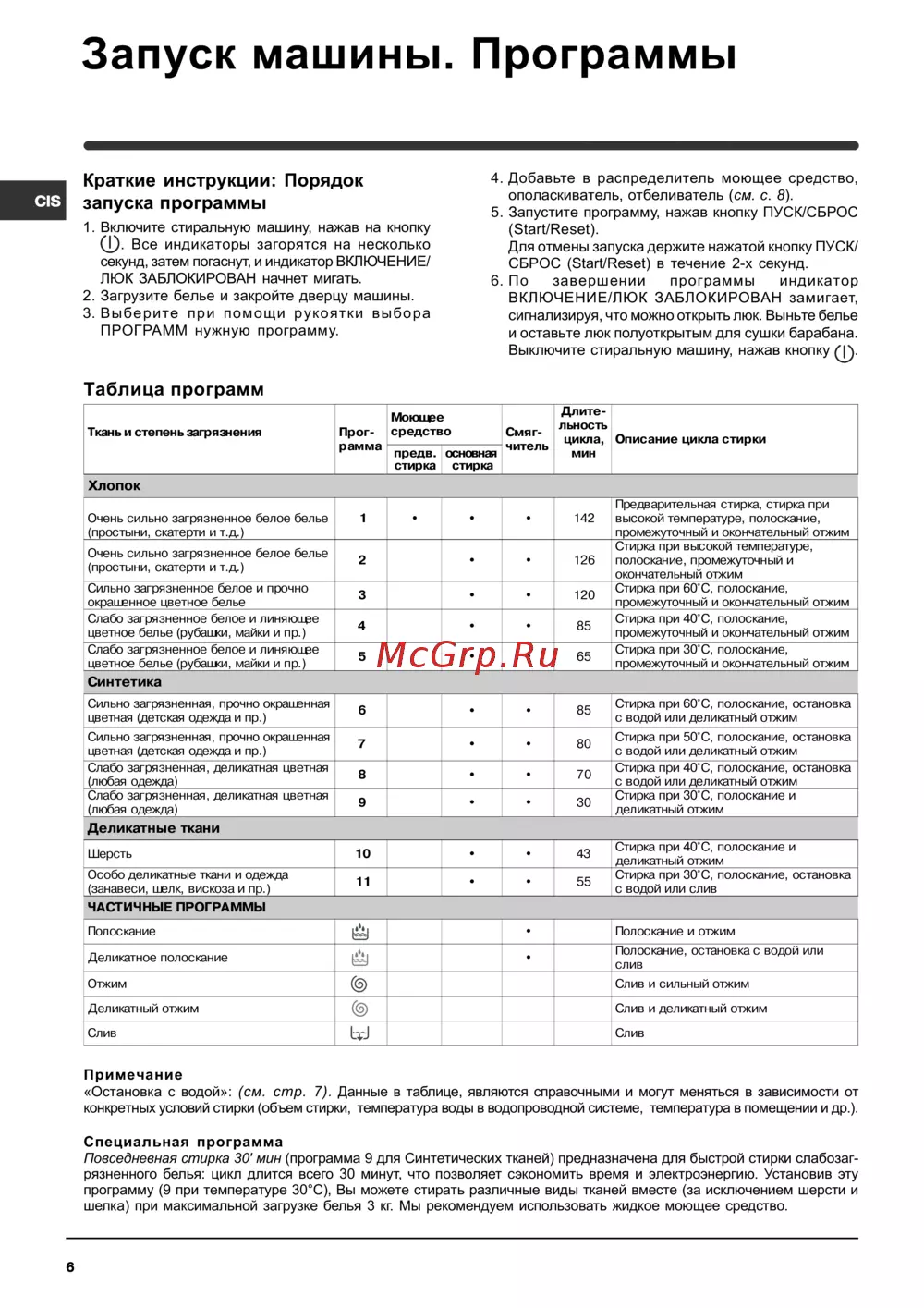 Запуск машины Программы Краткие инструкции запуска программы СБ 4 Порядок 1 Включите стиральную машину нажав на кнопку Все индикаторы загорятся на несколько секунд затем погаснут и индикатор ВКЛЮЧЕНИЕ ЛЮК ЗАБЛОКИРОВАН начнет мигать 2 Загрузите белье и закройте дверцу машины 3 Выберите при помощи рукоятки выбора ПРОГРАММ нужную программу Добавьте в распределитель моющее средство ополаскиватель отбеливатель см с 8 5 Запустите программу нажав кнопку ПУСК СБРОС 81аП Реэе1 Для отмены запуска держите нажатой кнопку ПУСК СБРОС 81аП Реэе1 в течение 2 х секунд 6 По завершении программы индикатор ВКЛЮЧЕНИЕ ЛЮК ЗАБЛОКИРОВАН замигает сигнализируя что можно открыть люк Выньте белье и оставьте люк полуоткрытым для сушки барабана Выключите стиральную машину нажав кнопку Таблица программ Ткань и степень загрязнения Программа Длите льность Смягцикла Описание цикла стирки читель предв основная мин стирка стирка Моюшре средство Хлопок Очень сильно загрязненное белое белье простыни скатерти и т д Очень сильно загрязненное белое белье простыни скатерти и т д 1 142 Предварительная стирка стирка при высокой температуре полоскание промежуточный и окончательный отжим Стирка при высокой температуре полоскание промежуточный и окончательный отжим Стирка при 60 С полоскание промежуточный и окончательный отжим Стирка при 40 С полоскание промежуточный и окончательный отжим Стирка при 30 С полоскание промежуточный и окончательный отжим 2 126 3 120 4 85 5 65 6 85 Стирка при 60 С полоскание остановка с водой или деликатный отжим 7 80 Стирка при 50 С полоскание остановка с водой или деликатный отжим 8 70 9 30 Шерсть 10 43 Особо деликатные ткани и одежда занавеси пел к вискоза и пр 11 55 Сильно загрязненное белое и прочно окраиенное цветное белье Слабо загрязненное белое и линяюнее цветное белье рубанки майки и пр Слабо загрязненное белое и л ин я юнее цветное белье рубанки майки и пр Синтетика Сильно загрязненная прочно окраненная цветная детская одежда и пр Сильно загрязненная прочно окраненная цветная детская одежда и пр Слабо загрязненная деликатная цветная Л1сбая одежда Слабо загрязненная деликатная цветная Л1сбая одежда Стирка при 40 С полоскание остановка с водой или деликатный отжим Стирка при 30 С полоскание и деликатный отжим Деликатные ткани Стирка при 40 С полоскание и деликатный отжим Стирка при 30 С полоскание остановка с водой или слив ЧАСТИЧНЫЕ ПРОГРАММЫ Полоскание Полоскание и отжим Деликатное полоскание Полоскание остановка с водой или слив Отжим Слив и сильный отжим Деликатный отжим Слив и деликатный отжим Слив Слив Примечание Остановка с водой см стр 7 Данные в таблице являются справочными и могут меняться в зависимости от конкретных условий стирки объем стирки температура воды в водопроводной системе температура в помещении и др Специальная программа Повседневная стирка 30 мин программа 9 для Синтетических тканей предназначена для быстрой стирки слабозагрязненного белья цикл длится всего 30 минут что позволяет сэкономить время и электроэнергию Установив эту программу 9 при температуре 30 С Вы можете стирать различные виды тканей вместе за исключением шерсти и шелка при максимальной загрузке белья 3 кг Мы рекомендуем использовать жидкое моющее средство 6