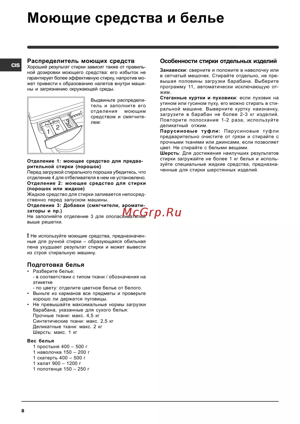 Моющие средства и белье Распределитель моющих средств CIS Хороший результат стирки зависит также от правиль ной дозировки моющего средства его избыток не гарантирует более эффективную стирку напротив мо жет привести к образованию налетов внутри маши ны и загрязнению окружающей среды Выдвиньте распредели тель и заполните его отделения моющим средством и смягчите лем Отделение 1 моющее средство для предва рительной стирки порошок Перед загрузкой стирального порошка убедитесь что отделение 4 для отбеливателя в нем не установлено Отделение 2 моющее средство для стирки порошок или жидкое Жидкое средство для стирки заливается непосред ственно перед запуском машины Отделение 3 Добавки смягчители аромати заторы и пр Не заполняйте отделение 3 для ополаскивателей выше решетки Не используйте моющие средства предназначен ные для ручной стирки образующаяся обильная пена ухудшает результат стирки и может вывести из строя стиральную машину Подготовка белья Разберите белье в соответствии с типом ткани обозначения на этикетке по цвету отделите цветное белье от белого Выньте из карманов все предметы и проверьте хорошо ли держатся пуговицы Не превышайте максимальные нормы загрузки барабана указанные для сухого белья Прочные ткани макс 4 5 кг Синтетические ткани макс 2 5 кг Деликатные ткани макс 2 кг Шерсть макс 1 кг Вес белья 1 простыня 400 500 г 1 наволочка 150 200 г 1 скатерть 400 500 г 1 халат 900 1200 г 1 полотенце 150 250 г 8 Особенности стирки отдельных изделий Занавески сверните и положите в наволочку или в сетчатый мешочек Стирайте отдельно не пре вышая половины загрузки барабана Выберите программу 11 автоматически исключающую от жим Стеганные куртки и пуховики если пуховик на утином или гусином пуху его можно стирать в сти ральной машине Выверните куртку наизнанку загрузите в барабан не более 2 3 кг изделий Повторите полоскание 1 2 раза используйте деликатный отжим Парусиновые туфли Парусиновые туфли предварительно очистите от грязи и стирайте с прочными тканями или джинсами если позволяет цвет Не стирайте с белыми вещами Шерсть Для достижения наилучших результатов стирки загружайте не более 1 кг белья и исполь зуйте специальные жидкие средства предназна ченные для стирки шерстянных изделий