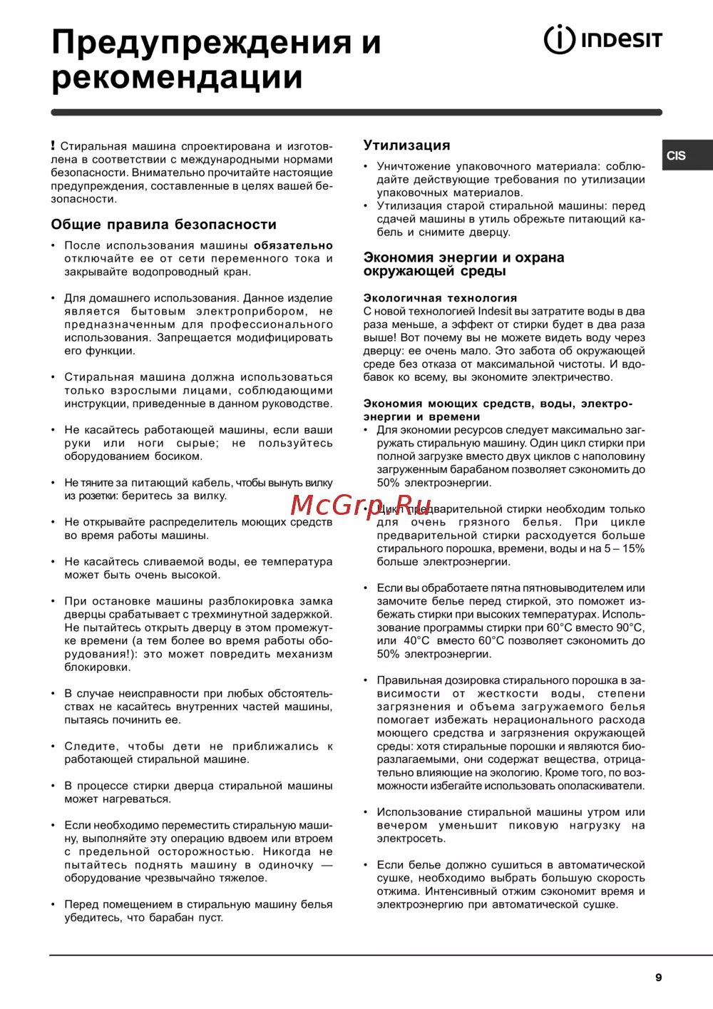 pmoesiT Предупреждения и рекомендации Стиральная машина спроектирована и изготов лена в соответствии с международными нормами безопасности Внимательно прочитайте настоящие предупреждения составленные в целях вашей бе зопасности Общие правила безопасности После использования машины обязательно отключайте ее от сети переменного тока и закрывайте водопроводный кран Для домашнего использования Данное изделие является бытовым электроприбором не предназначенным для профессионального использования Запрещается модифицировать его функции Стиральная машина должна использоваться только взрослыми лицами соблюдающими инструкции приведенные в данном руководстве Не касайтесь работающей машины руки или ноги сырые не оборудованием босиком если ваши пользуйтесь Не тяните за питающий кабель чтобы вынуть вилку из розетки беритесь за вилку Утилизация Уничтожение упаковочного материала соблю дайте действующие требования по утилизации упаковочных материалов Утилизация старой стиральной машины перед сдачей машины в утиль обрежьте питающий ка бель и снимите дверцу Экономия энергии и охрана окружающей среды Экологичная технология С новой технологией Indesit вы затратите воды в два раза меньше а эффект от стирки будет в два раза выше Вот почему вы не можете видеть воду через дверцу ее очень мало Это забота об окружающей среде без отказа от максимальной чистоты И вдо бавок ко всему вы экономите электричество Экономия моющих средств воды электро энергии и времени Для экономии ресурсов следует максимально заг ружать стиральную машину Один цикл стирки при полной загрузке вместо двух циклов с наполовину загруженным барабаном позволяет сэкономить до 50 электроэнергии Не открывайте распределитель во время работы машины Не касайтесь сливаемой может быть очень высокой При остановке машины разблокировка замка дверцы срабатывает с трехминутной задержкой Не пытайтесь открыть дверцу в этом промежут ке времени а тем более во время работы обо рудования это может повредить механизм блокировки воды моющих ее средств температура В случае неисправности при любых обстоятель ствах не касайтесь внутренних частей машины пытаясь починить ее Следите чтобы дети не работающей стиральной машине В процессе стирки может нагреваться дверца приближались стиральной к машины Если необходимо переместить стиральную маши ну выполняйте эту операцию вдвоем или втроем с предельной осторожностью Никогда не пытайтесь поднять машину в одиночку оборудование чрезвычайно тяжелое Перед помещением в стиральную машину белья убедитесь что барабан пуст CIS Цикл предварительной стирки необходим только для очень грязного белья При цикле предварительной стирки расходуется больше стирального порошка времени воды и на 5 15 больше электроэнергии Если вы обработаете пятна пятновыводителем или замочите белье перед стиркой это поможет из бежать стирки при высоких температурах Исполь зование программы стирки при 60 С вместо 90 С или 40 С вместо 60 С позволяет сэкономить до 50 электроэнергии Правильная дозировка стирального порошка в за висимости от жесткости воды степени загрязнения и объема загружаемого белья помогает избежать нерационального расхода моющего средства и загрязнения окружающей среды хотя стиральные порошки и являются био разлагаемыми они содержат 