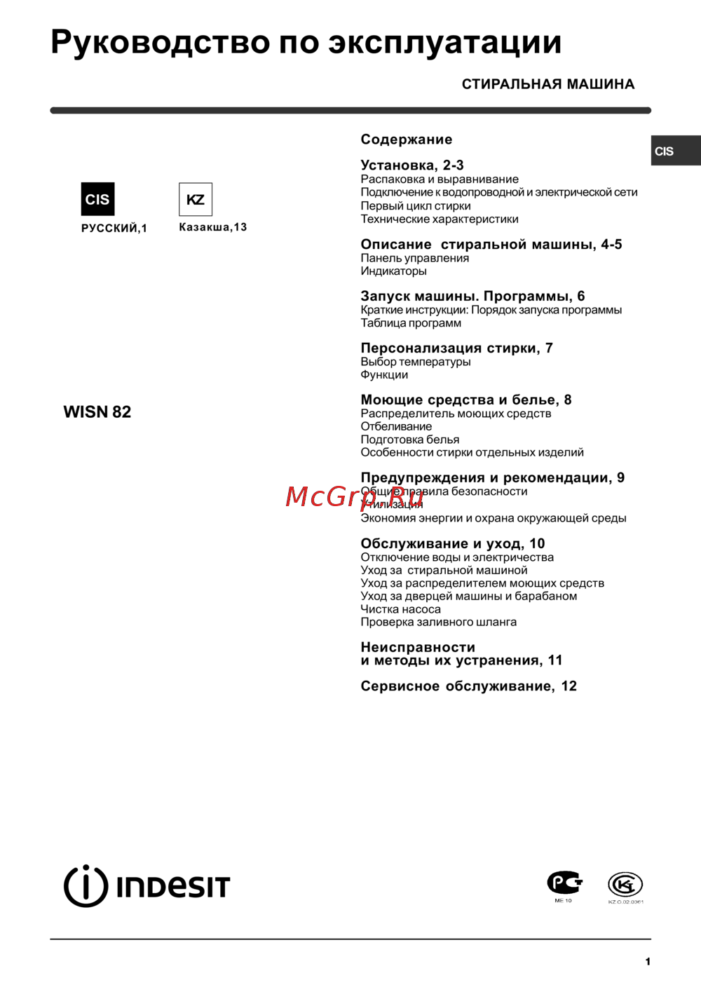 Indesit WISN 82 Руководство по эксплуатации онлайн