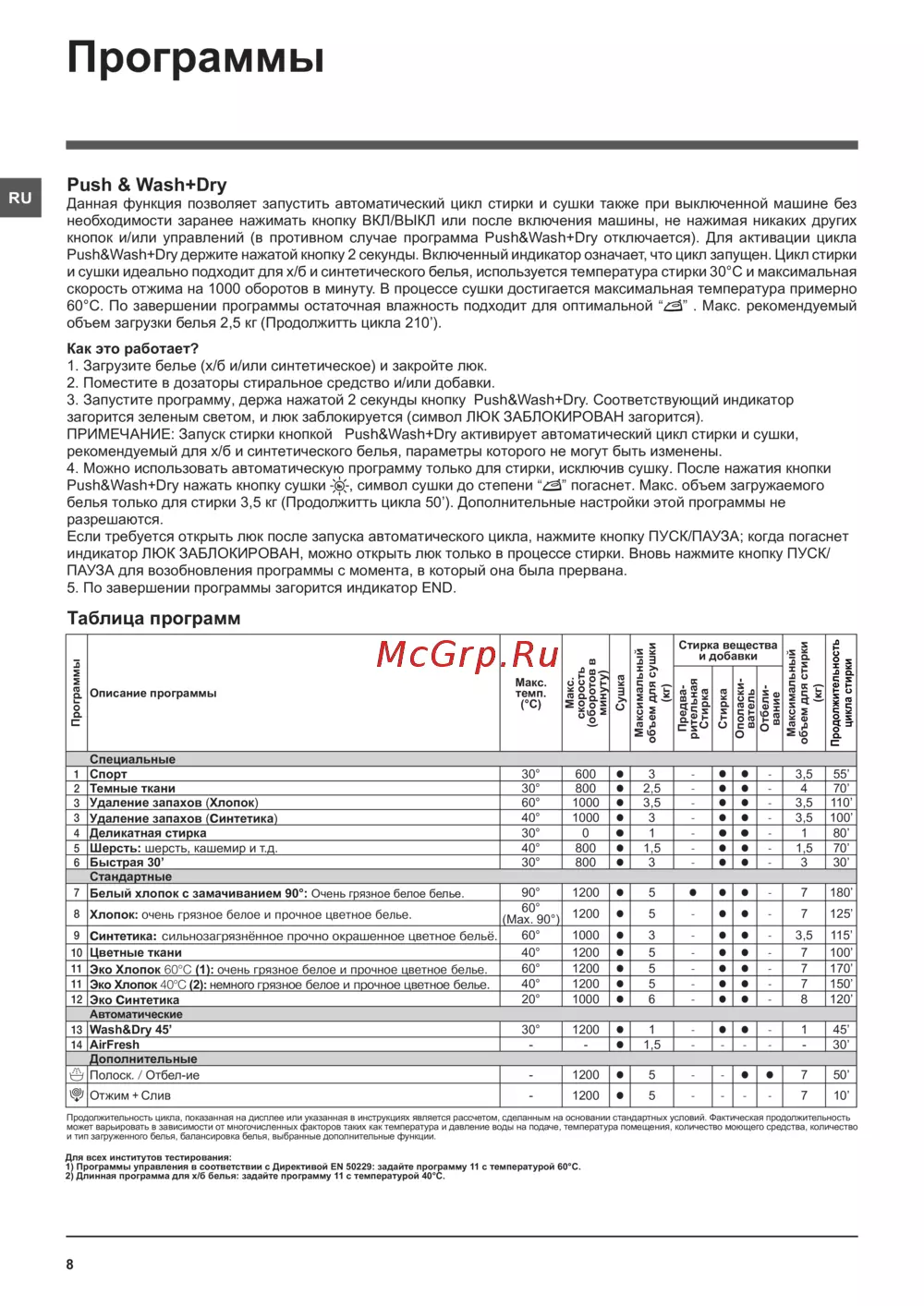 - Данная функция позволяет запустить автоматический цикл стирки и сушки также при выключенной машине без необходимости заранее нажимать кнопку вкл выкл или после включения машины не нажимая никаких других кнопок и или управлений в противном случае программа push wash dry отключается для активации цикла push wash dry держите нажатой кнопку 2 секунды включенный индикатор означает что цикл запущен цикл стирки и сушки идеально подходит для х б и синтетического белья используется температура стирки 30 с и максимальная скорость отжима на 1000 оборотов в минуту в процессе сушки достигается максимальная температура примерно 60 c по завершении программы остаточная влажность подходит для оптимальной макс рекомендуемый p.8