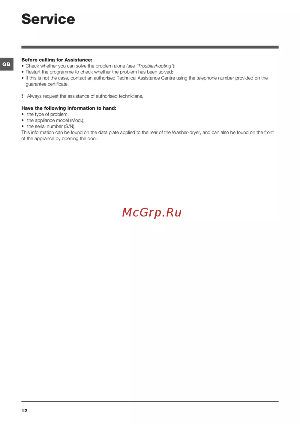 ! Always request the assistance of authorised technicians.