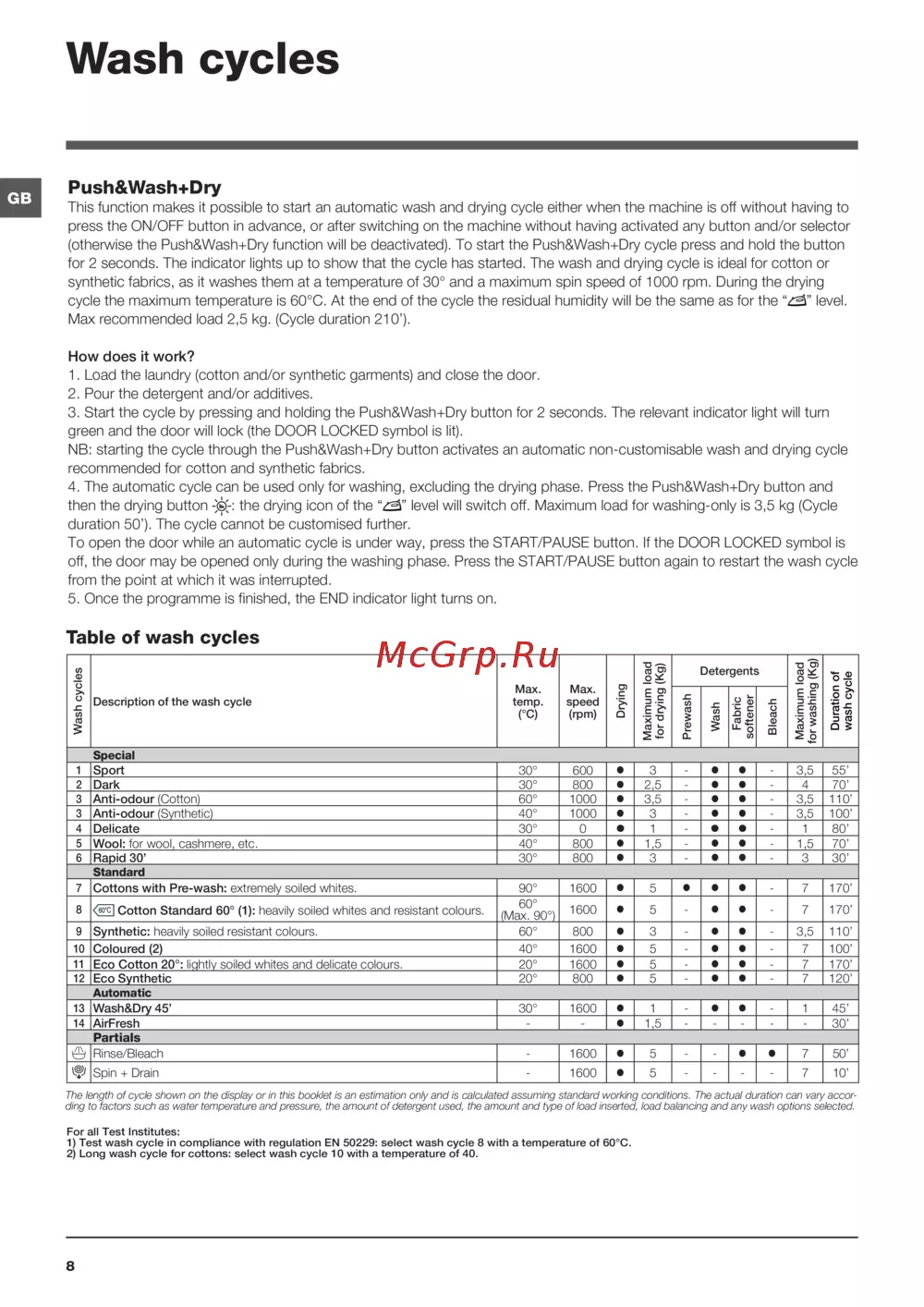 1) Test wash cycle in compliance with regulation EN 50229: select wash cycle 8 with a temperature of 60°C.