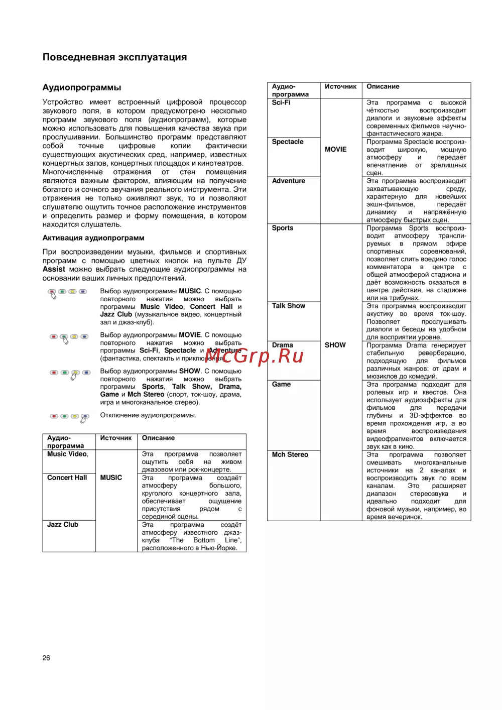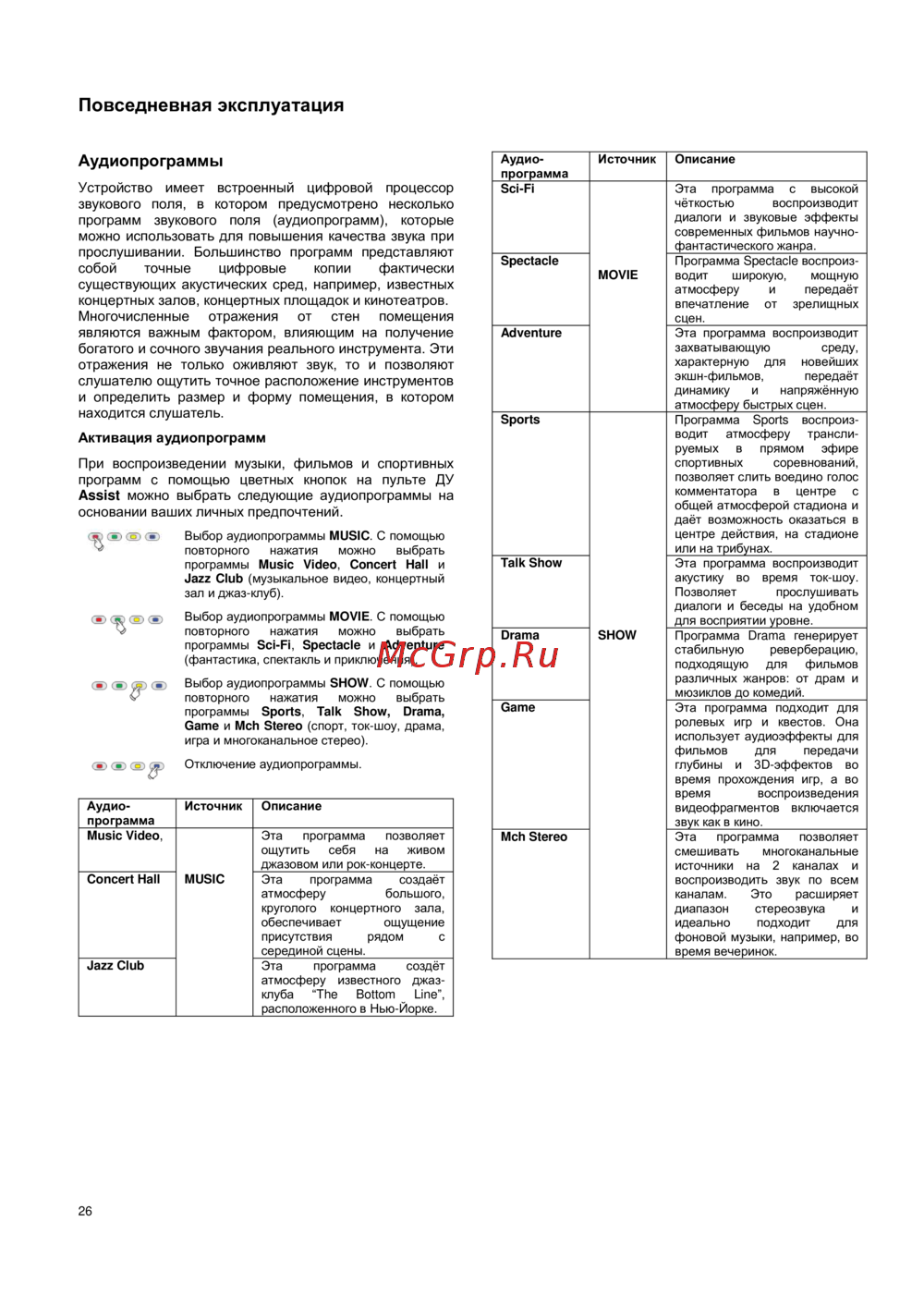 - Выбрать нужный аудиорежим повторным нажатием кнопки p.24