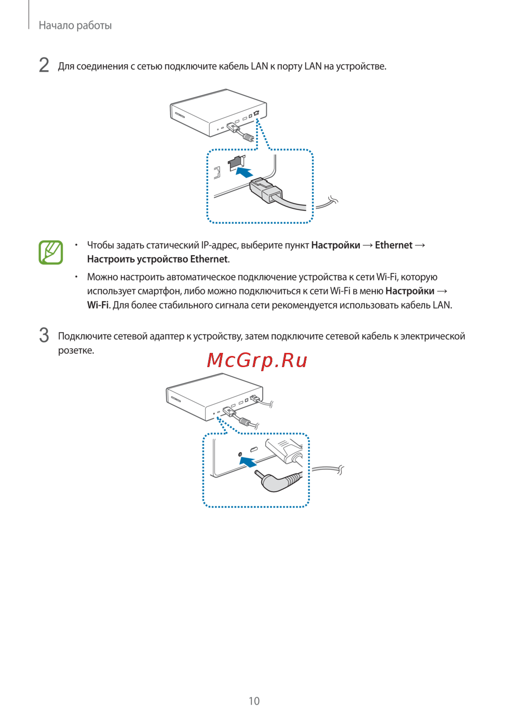 Подключите сетевой адаптер к устройству, затем подключите сетевой кабель к электрической