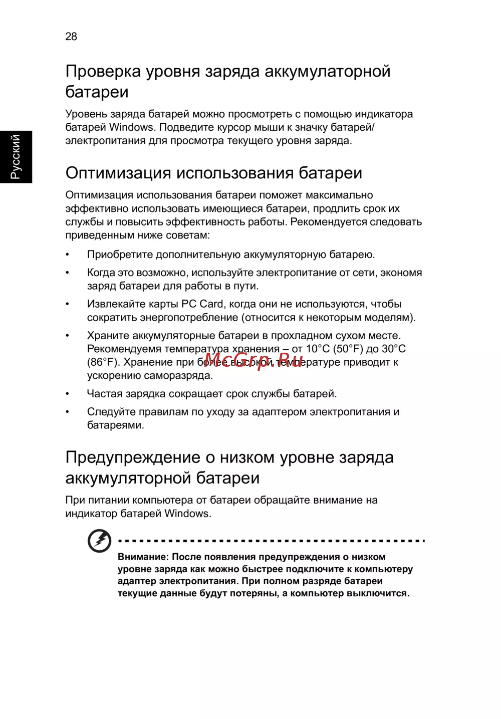- При появлении предупреждения о низком уровне заряда необходимо предпринять одно из следующих действий p.51