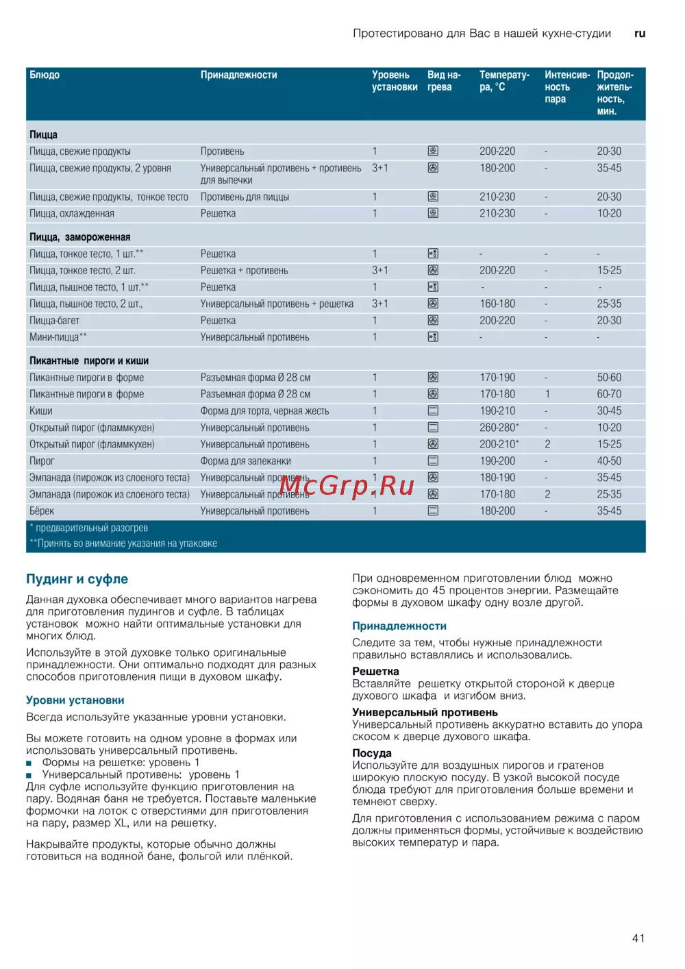 для приготовления пудингов и суфле. В таблицах